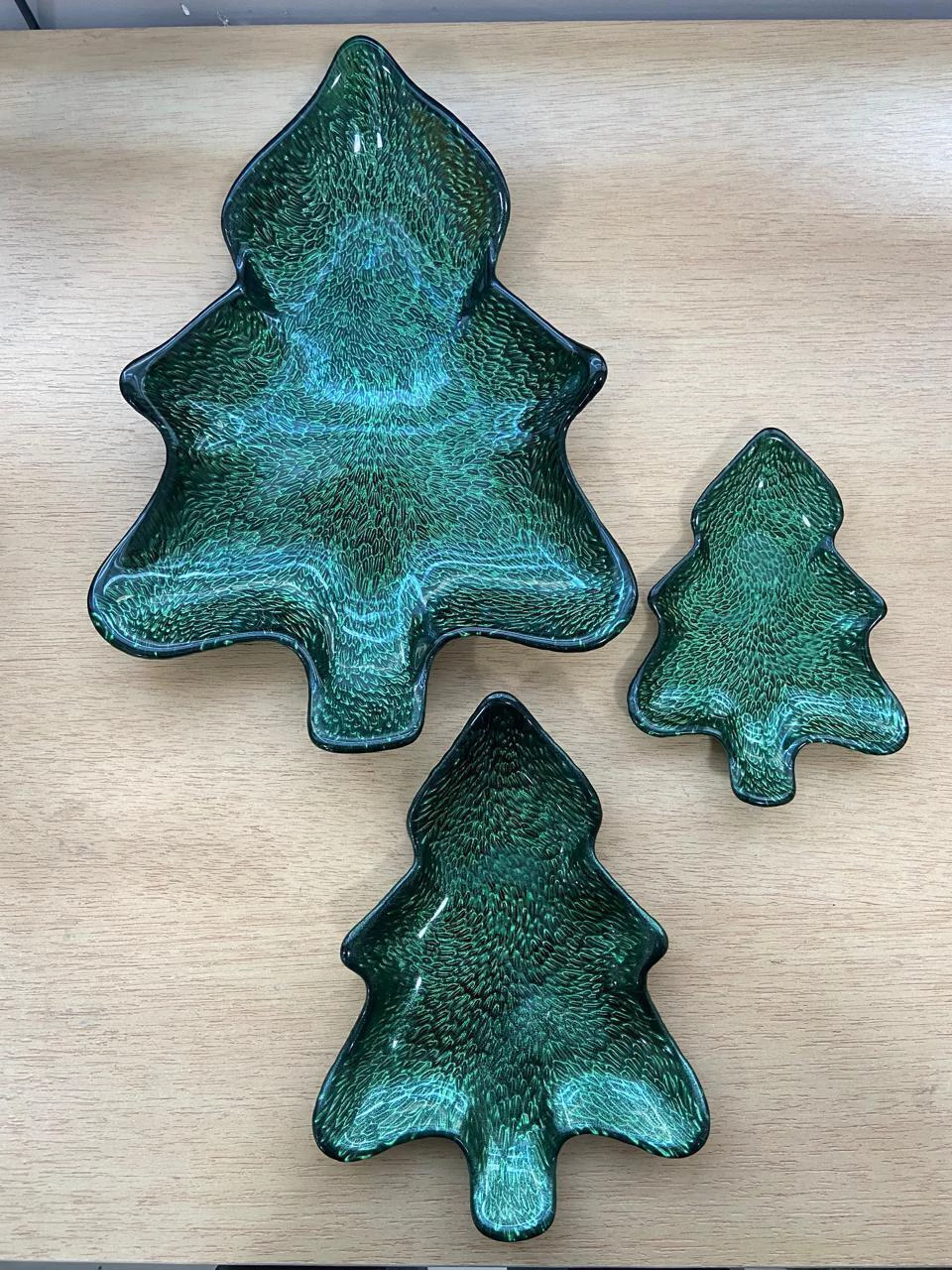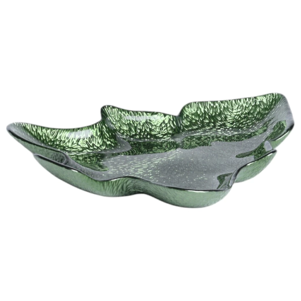 Design e Textura Exclusivos: Feita em vidro robusto na cor verde natalina, a petisqueira possui uma textura interna detalhada que simula a folhagem do pinheiro, oferecendo um efeito visual que lembra o vidro artesanal (estilo Murano).