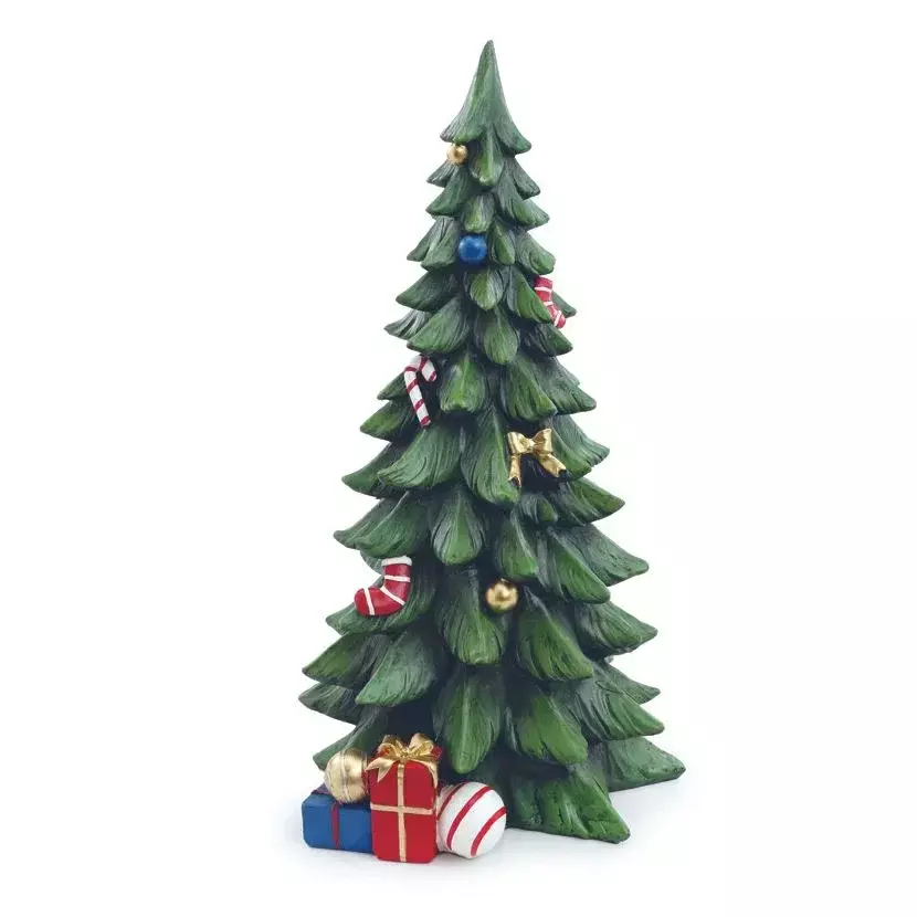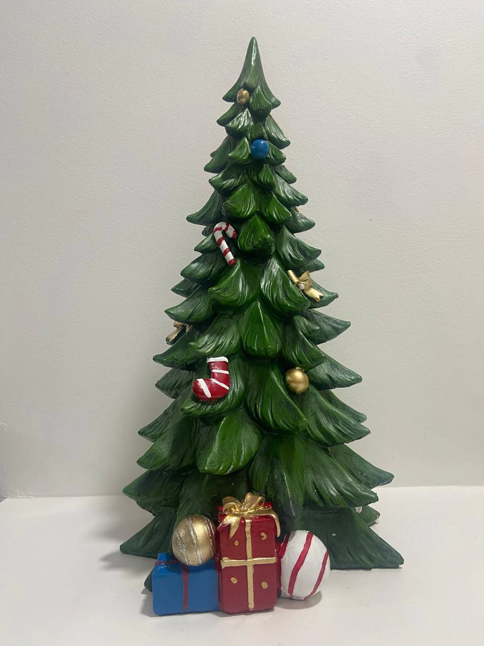 O item na foto é uma mini-árvore de Natal decorativa e estatueta, ideal para enfeitar mesas, prateleiras ou lareiras. A peça possui uma aparência robusta e esculpida, sugerindo ser feita de um material como resina ou cerâmica.