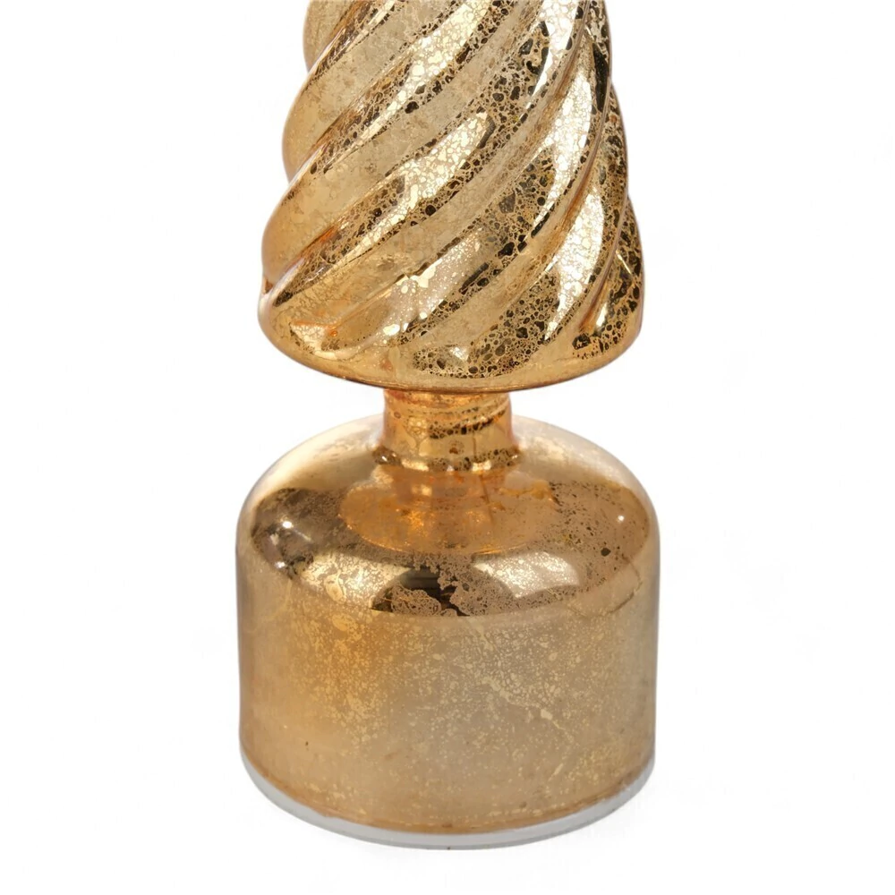 Com 30cm de altura, a peça tem uma silhueta elegante de cone com uma textura espiralada marcante, todo na cor dourada. O grande atrativo está na sua base, que contém glitter e possui um mecanismo que o faz girar, criando o efeito de uma "neve" cintilante em movimento.