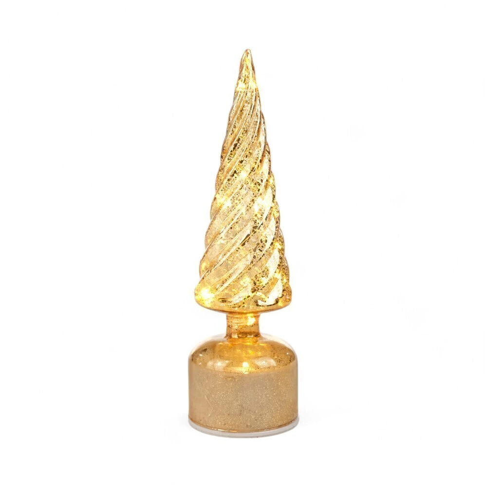O pinheiro é iluminado por luzes LED internas que realçam o brilho do dourado. Por ser um item decorativo de mesa com luz, ele é geralmente alimentado por pilhas (como as pilhas AA), permitindo que você o posicione livremente em qualquer lugar sem a necessidade de tomadas.