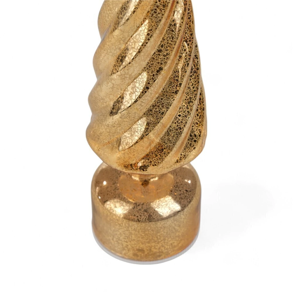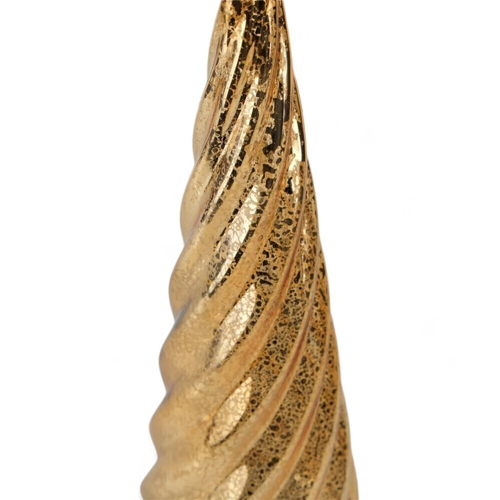 Com 40cm de altura, a peça tem uma silhueta elegante de cone com uma textura espiralada marcante, todo na cor dourada. O grande atrativo está na sua base, que contém glitter e possui um mecanismo que o faz girar, criando o efeito de uma "neve" cintilante em movimento.