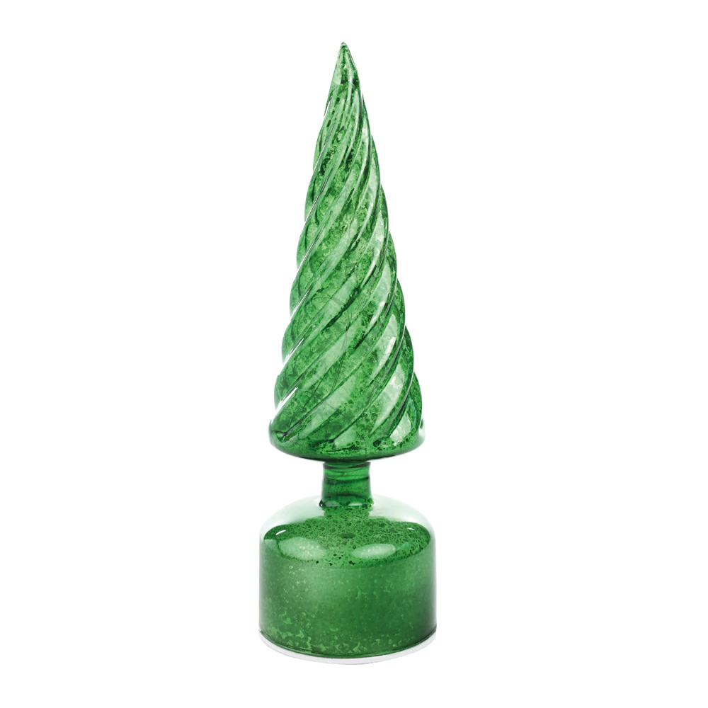 Com 30cm de altura, a peça tem uma silhueta elegante de cone com uma textura espiralada marcante, todo na cor verde. O grande atrativo está na sua base, que contém glitter e possui um mecanismo que o faz girar, criando o efeito de uma "neve" cintilante em movimento.