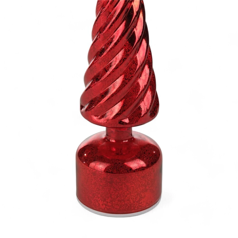 Com 30cm de altura, esta estatueta de mini árvore se destaca pelo seu design moderno, com uma superfície vermelha vibrante e uma textura marcante de espiral ou torção. A peça emite um brilho festivo graças às luzes LED internas.