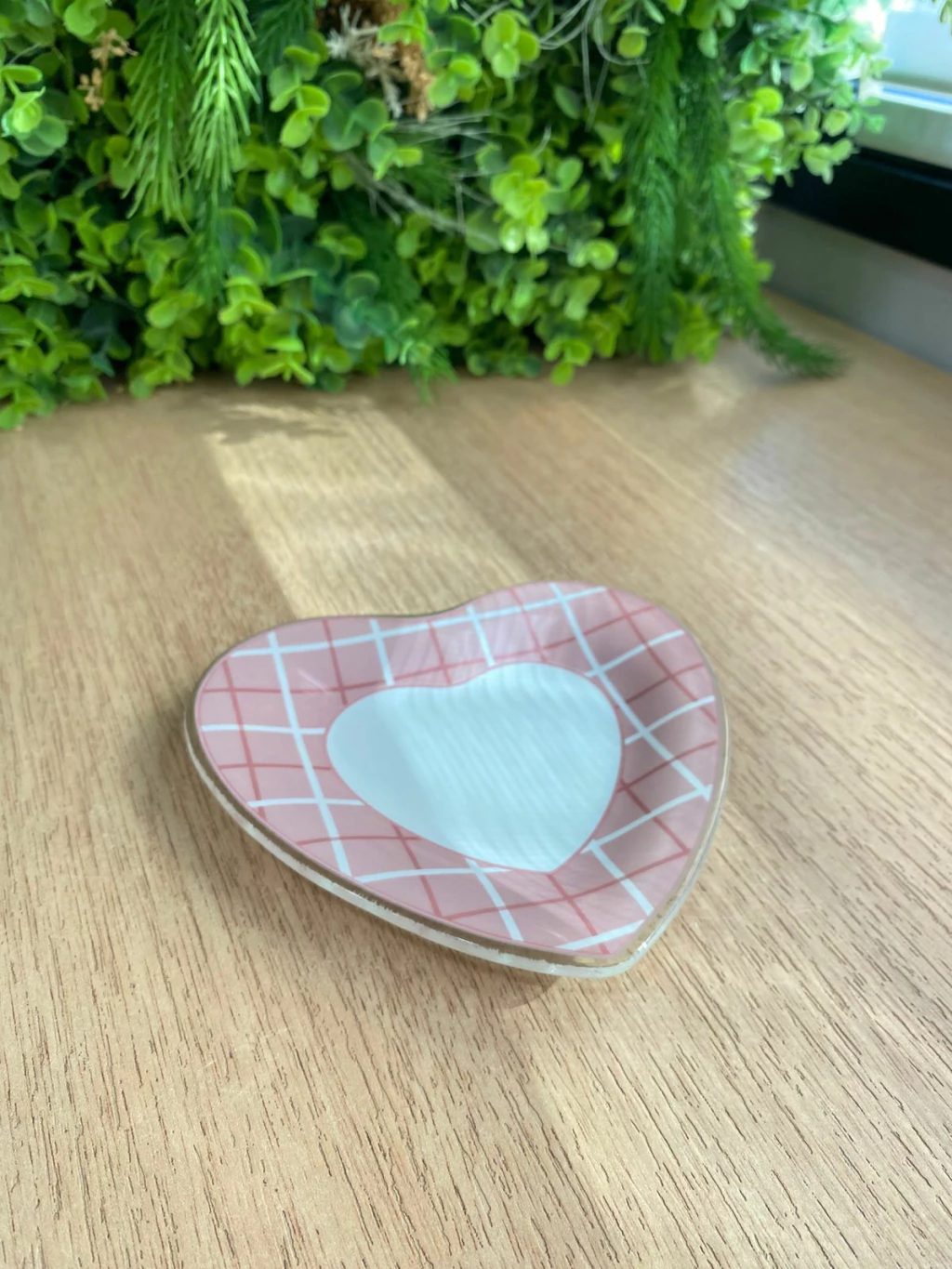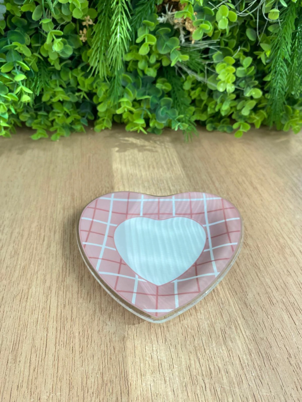 Sua superfície é adornada com um delicado padrão quadriculado em tons de rosa e branco, que emoldura um coração central branco e sólido. A combinação de texturas e cores cria um visual moderno e meigo, perfeito para complementar um café da tarde ou um momento especial.