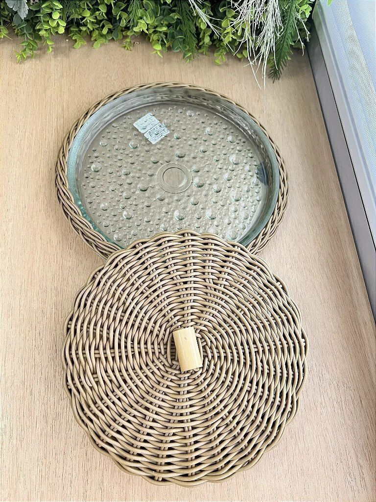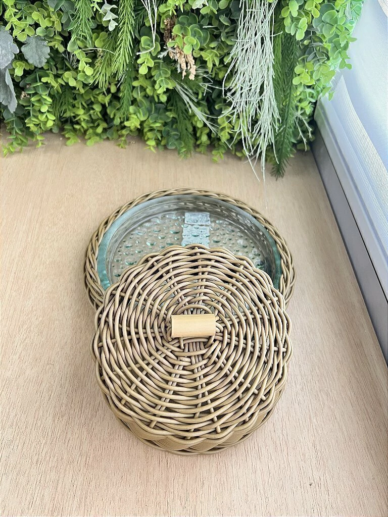 Que peça charmosa! Este porta bolo combina a elegância do vidro com o toque natural e acolhedor do bambu e vime em um tom caramelo quente. Com dimensões de 30cm de diâmetro e 14cm de altura, ele é perfeito para apresentar seus bolos, tortas e outras delícias com um toque de sofisticação rústica. A alça de bambu vime não só facilita o transporte, como também adiciona um detalhe artesanal encantador à peça. Ideal para compor a mesa em diversas ocasiões, desde um café da tarde casual até celebrações especiais.