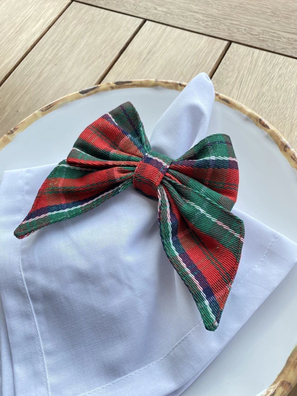 Estampa Clássica (Tartan): O laço é confeccionado em um tecido com a clássica estampa xadrez escocês (Tartan). A padronagem utiliza as cores emblemáticas do Natal: vermelho intenso, verde-escuro e toques de branco e preto, que adicionam profundidade e alegria.