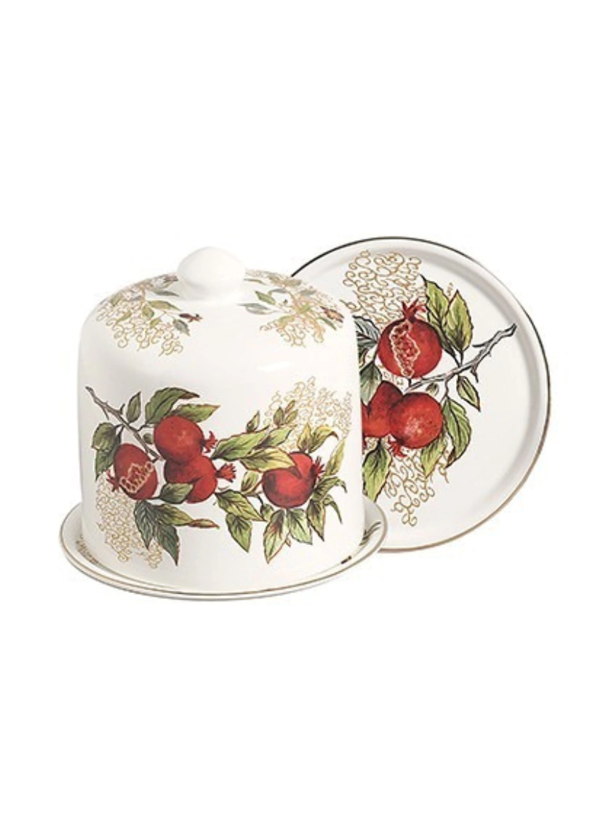 A peça, feita de cerâmica, conta com uma cúpula e um prato que se unem para manter o panetone, bolo ou queijo frescos e protegidos. A estampa, rica em detalhes, apresenta romãs e folhagens em tons quentes, com acabamentos em dourado que adicionam um toque de luxo. Perfeito para servir com elegância ou como um destaque na decoração de Natal