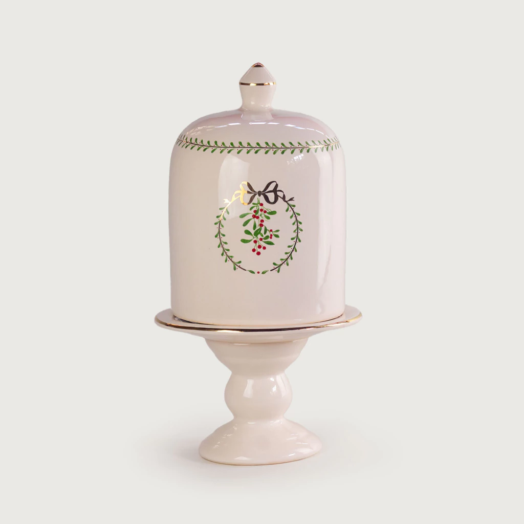 Decoração Exclusiva: A cúpula é adornada com a charmosa guirlanda de folhas verdes e frutos vermelhos, destacada por um laço preto e acabamento em dourado (metalizado), que intensifica o tema natalino com um toque sofisticado.