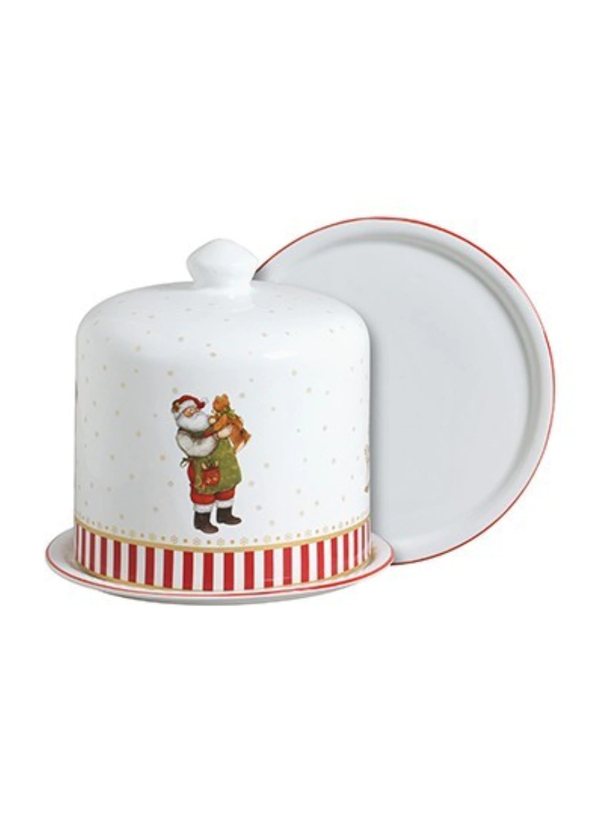 A cúpula de cerâmica, com sua estampa delicada de Papai Noel e pontos dourados, repousa sobre uma base de prato combinando, adornada com listras vermelhas e douradas que evocam a alegria do Natal. Ideal para panetones, bolos, tortas e queijos, ele não só mantém os alimentos frescos, mas também adiciona um toque de magia e elegância à sua mesa de Natal.