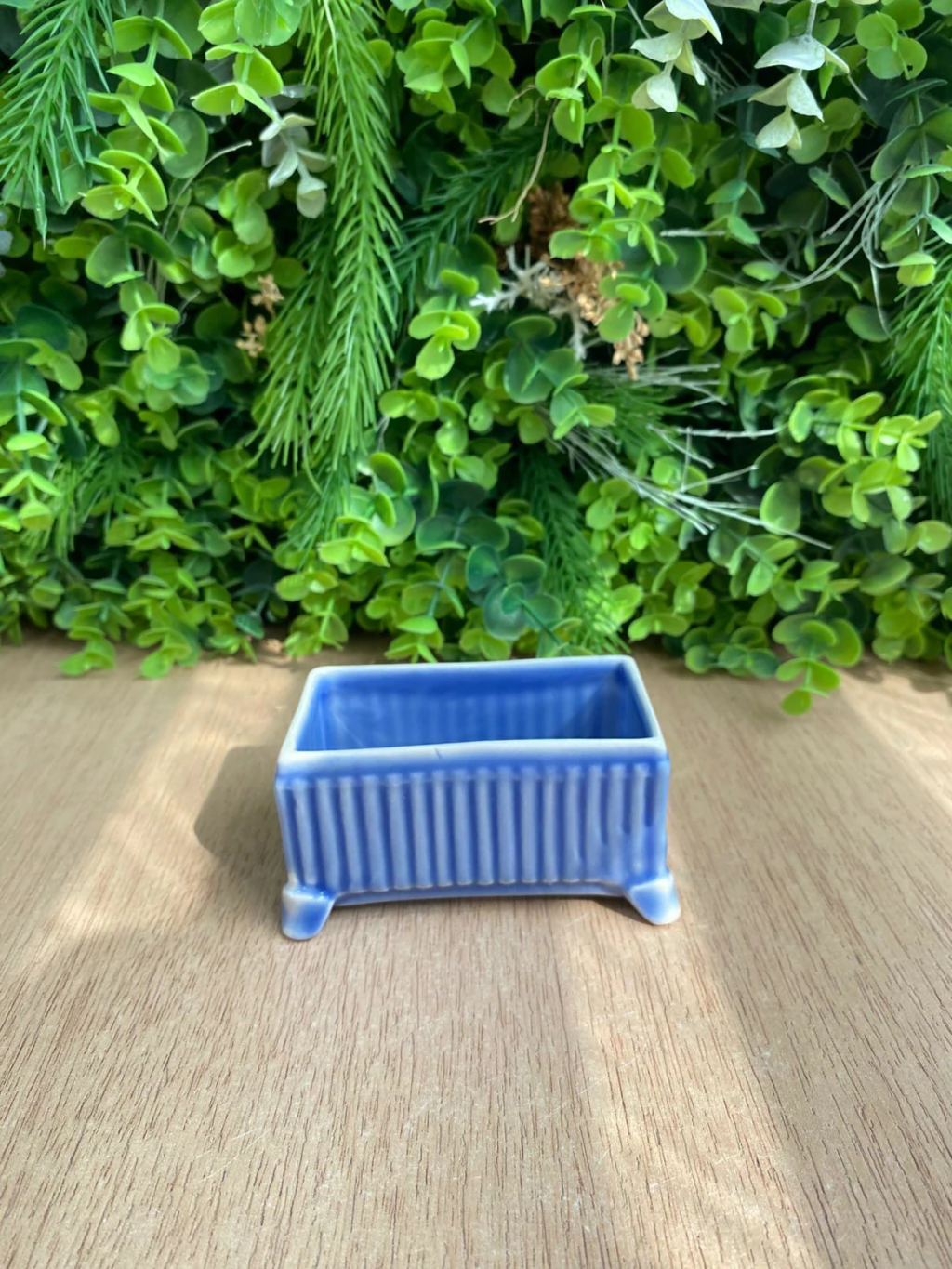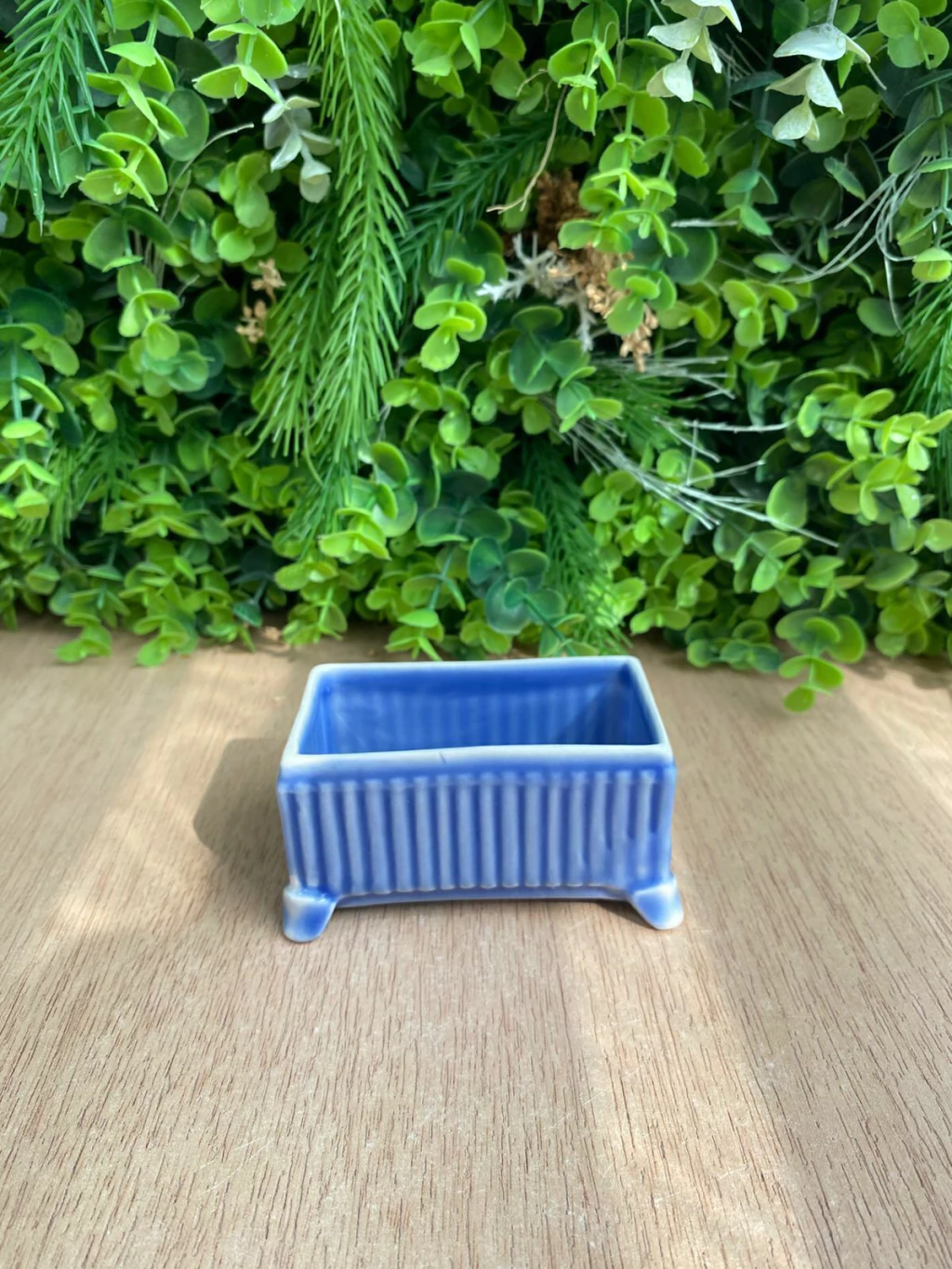 As laterais são decoradas com texturas verticais, que lembram pequenas colunas, dando um toque clássico e sofisticado. A peça é sustentada por quatro pequenos pés arredondados, de cor clara, que criam um contraste sutil com o azul do corpo principal.