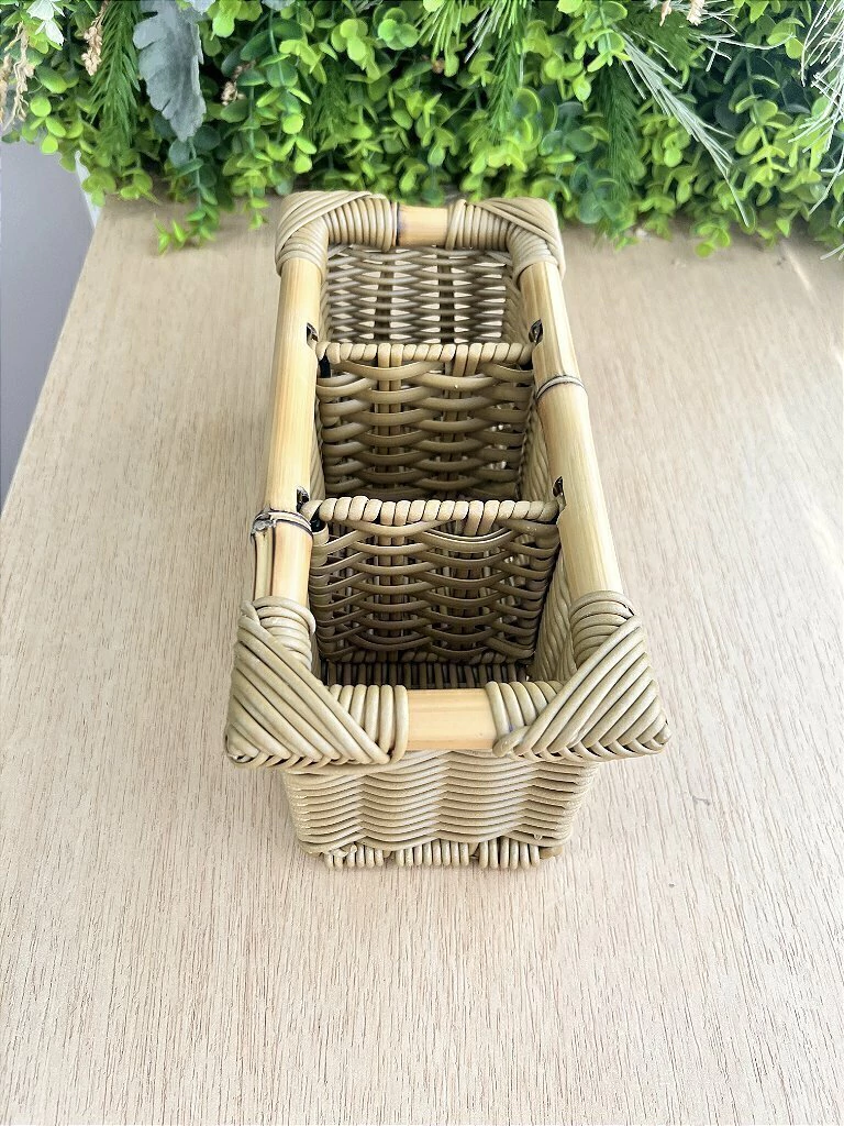 Ideal para acomodar os talheres naquele almoço informal. O Vime natural garante o aspecto moderno, rústico, sem deixar de ser sofisticado. Contando com 4 repartições, facilmente acomodará os talheres na sua bancada, mesa ou churrasqueira. A peça também poderá ser utilizada para fazer arranjos florais e decorar sua mesa. Cuidados: Limpar manualmente Não molhar o produto. Utilizar pano úmido no local sujo. Não colocar na lava-louças. Armazenar em local seco e arejado. Tamanho: 24 x 10 x 10