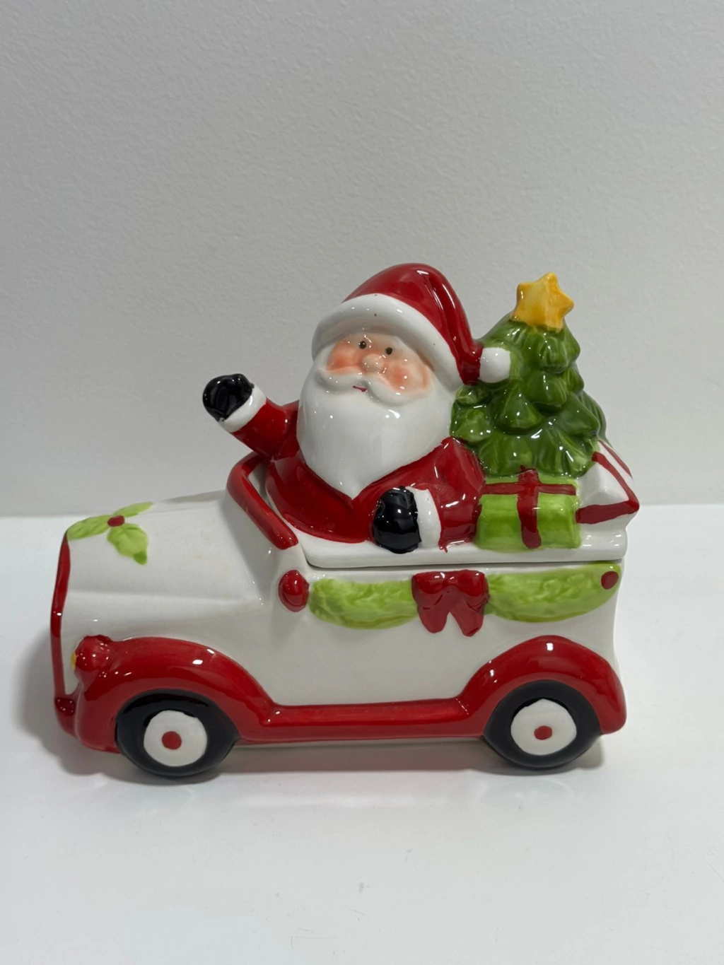 O item é um encantador pote decorativo de Natal feito de porcelana, com o formato do Papai Noel dirigindo um carro vintage e carregado de presentes.