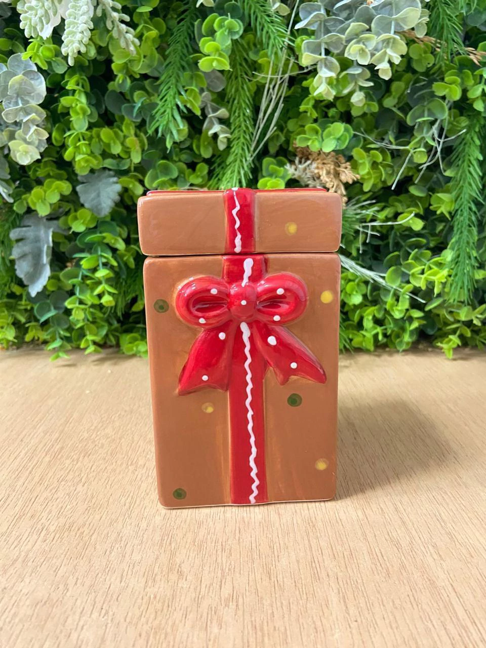 Formato de Presente: O pote é esculpido no formato clássico de uma caixa de presente, com uma tampa separada.
