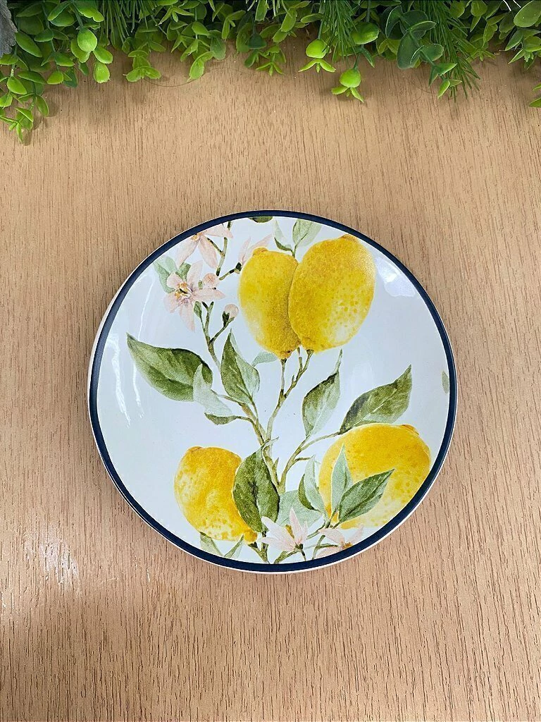 Esse Prato é elegantemente emoldurado por uma borda azul marinho, adicionando um toque de sofisticação e contraste. No centro, duas delicadas imagens de limão siciliano se destacam, capturando a essência cítrica e ensolarada da ilha. É a união perfeita entre a beleza natural e o design refinado, ideal para realçar suas criações culinárias.