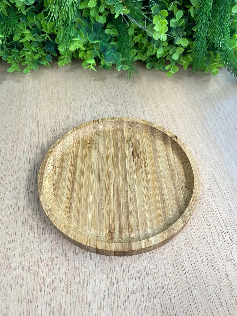 Feito em bambu, um material conhecido por sua resistência e leveza, o prato possui um formato redondo com uma borda levemente elevada, ideal para servir pequenas porções de petiscos, sobremesas, pães, queijos ou frutas. A tonalidade clara e os veios naturais da madeira de bambu garantem que cada peça seja única.