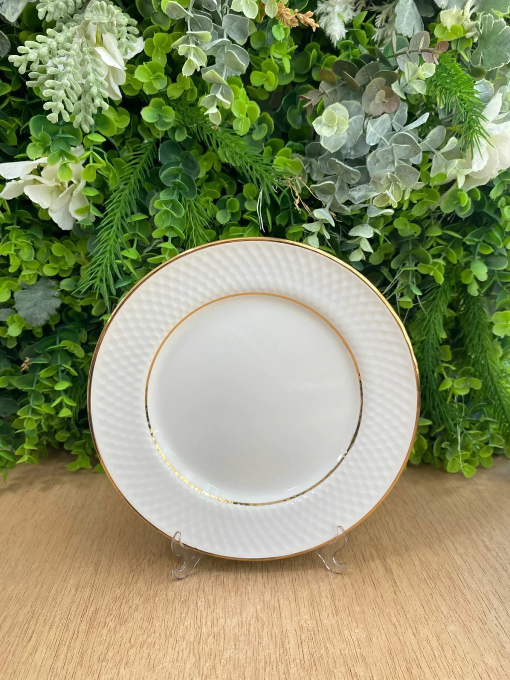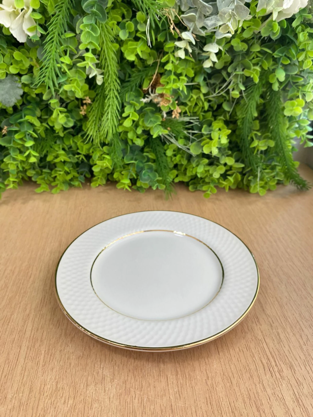 Este é um prato de sobremesa da linha Dubai, com um design elegante e sofisticado. O prato é feito de porcelana branca e possui um acabamento de alta qualidade. O destaque fica por conta do design texturizado na borda, com um padrão em losangos em relevo, e um filete dourado que contorna tanto a borda externa quanto o centro liso do prato. É perfeito para servir sobremesas com estilo em ocasiões especiais.