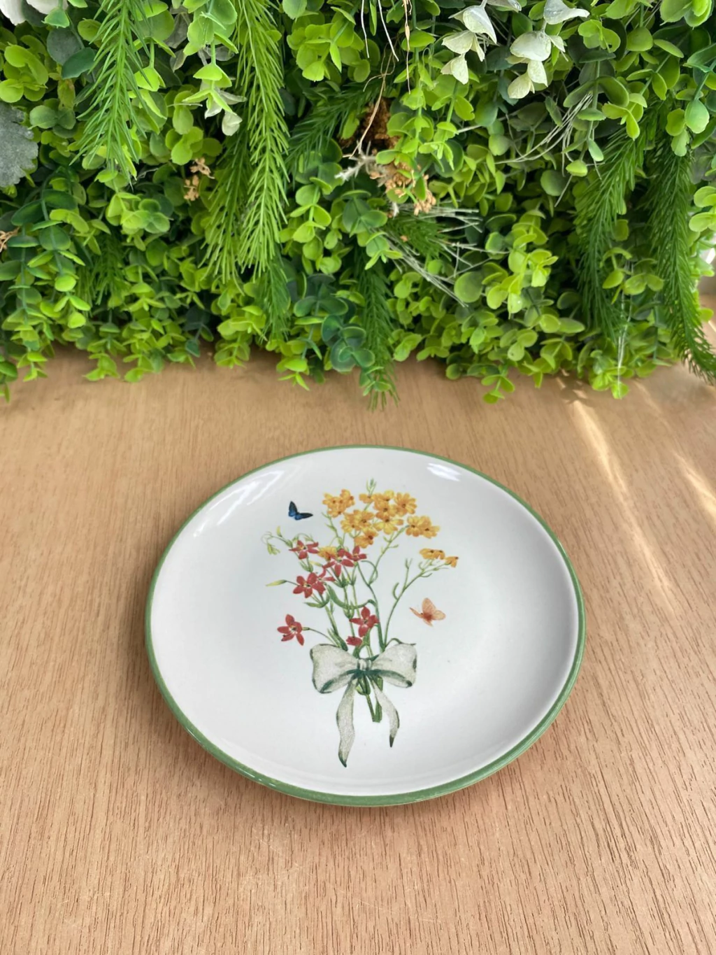 Encantador e delicado, o Prato de Sobremesa Florescer traz a leveza da natureza para sua mesa. Com borda verde suave e a ilustração de um buquê de flores coloridas envolto por um laço, além de borboletas que completam a cena, ele transmite frescor, romantismo e elegância. Ideal para servir doces, frutas e sobremesas com charme, tornando cada detalhe da mesa ainda mais especial.