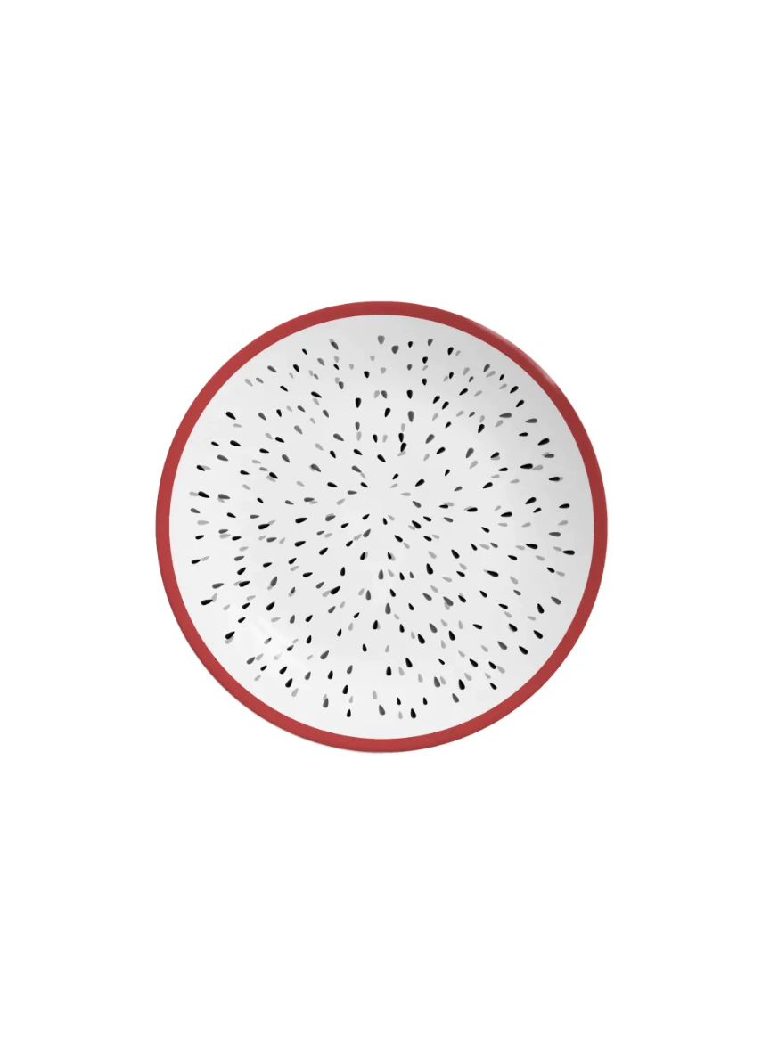 Com uma estampa vibrante e inspirada na fruta, o design em tons de branco e preto com a borda vermelha e vibrante cria um visual único e divertido. É o prato perfeito para servir bolos, frutas e doces, tornando qualquer sobremesa mais especial.
