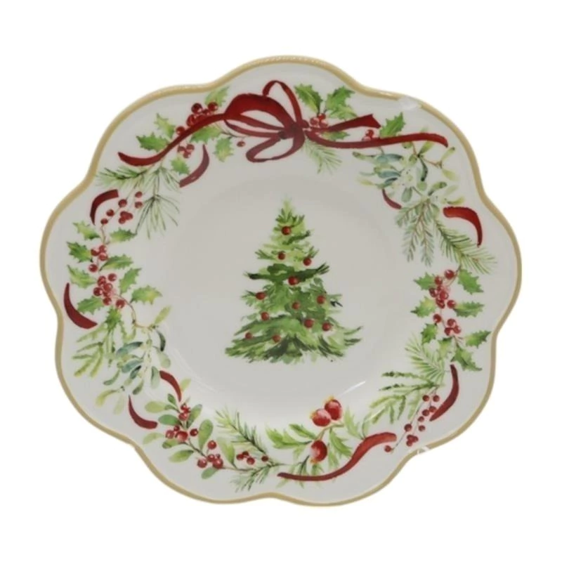 Acabamento: A borda festonada é contornada por um elegante filete de ouro (ou dourado), que realça o formato do prato e adiciona um toque de luxo ao tema natalino.