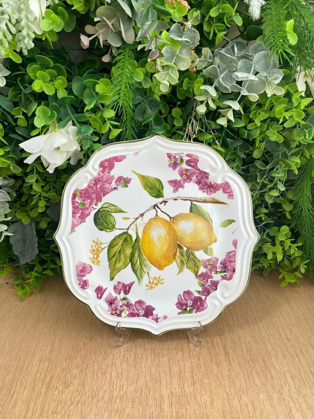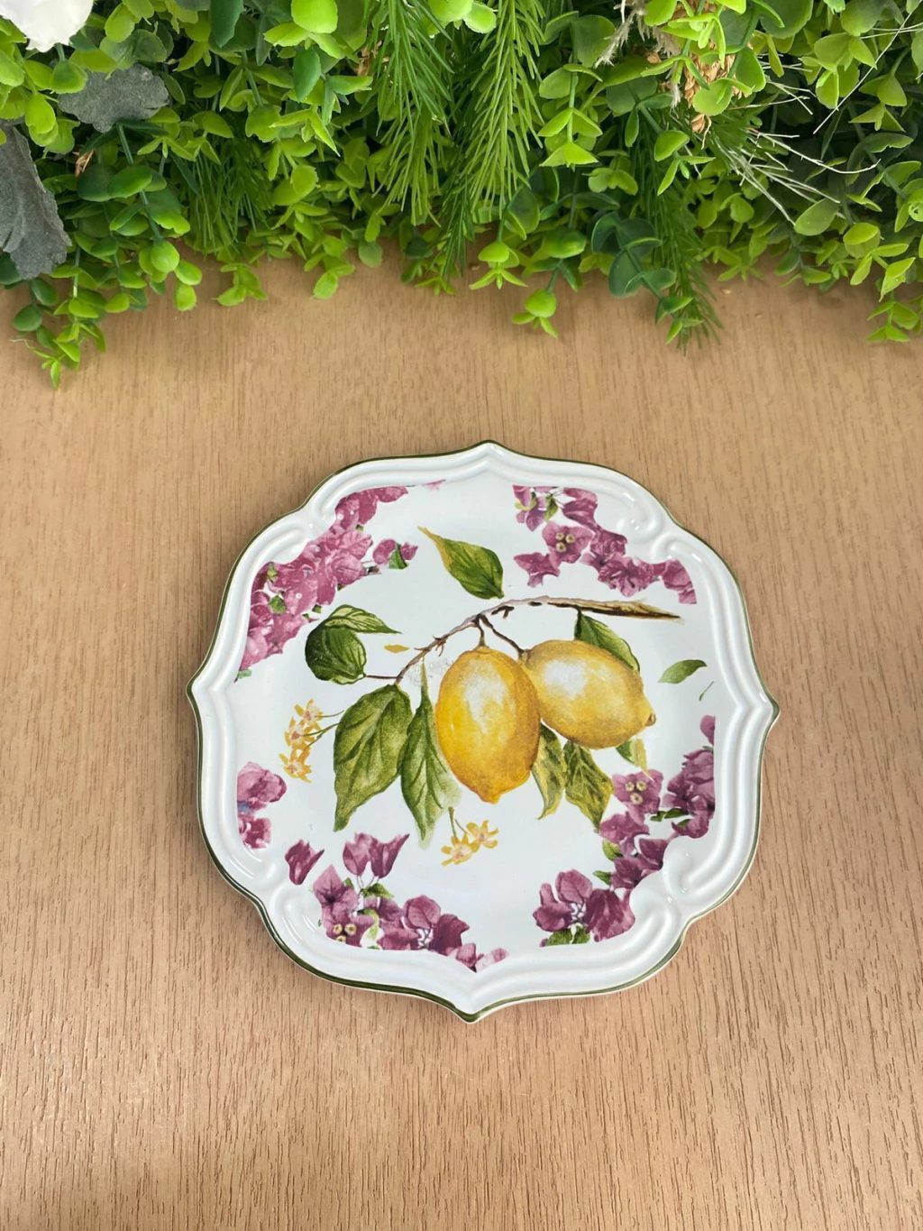 Traga o frescor e o charme do sul da Europa para a sua mesa com o encantador Prato de Sobremesa Jardim Mediterrâneo 1. Com um delicado formato com bordas onduladas e acabamento clássico, este prato é decorado com limões vibrantes e ramos floridos em tons de rosa e amarelo, evocando a beleza das paisagens mediterrâneas em plena floração.