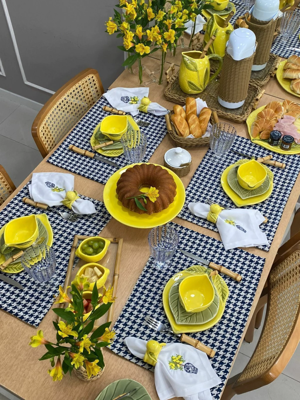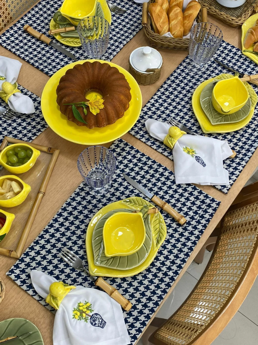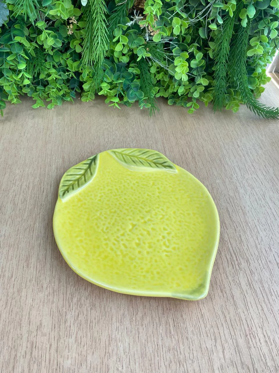O Prato de Sobremesa Lemon Garden é uma peça de cerâmica charmosa e alegre, perfeita para servir sobremesas ou pequenos petiscos. Com um formato que imita a silhueta de um limão, ele se destaca pela sua cor amarela vibrante e textura sutil que remete à casca da fruta. As folhas verdes, pintadas com detalhes em relevo na parte superior, adicionam um toque de realismo e delicadeza. A peça repousa sobre uma superfície de madeira clara, com um fundo de folhagens verdes que complementa o tema natural e fresco do prato. É uma adição perfeita para quem busca trazer um toque de natureza e cor à mesa.