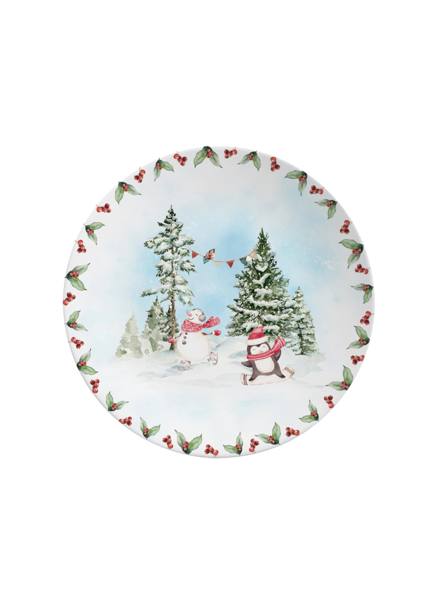 Feito de cerâmica, o prato tem uma estampa lúdica e delicada, com um pinguim e um boneco de neve em um cenário com pinheiros e neve. A borda do prato é enfeitada com ramos de azevinho e bolinhas que lembram azeitonas.