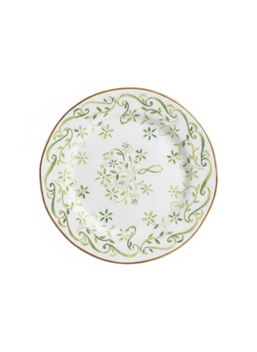 A estampa central apresenta um ramo de folhas e flores em tons de verde, que se expande para as bordas em forma de uma guirlanda elegante. Um filete dourado na borda externa adiciona um toque sutil de brilho e sofisticação, complementando o design natural e festivo. Este prato é ideal para compor uma mesa posta charmosa e acolhedora na época do Natal e em outras ocasiões especiais.