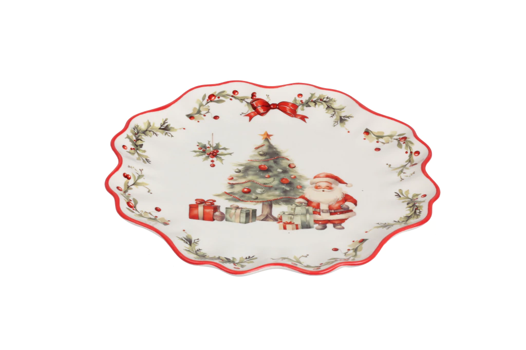 Cena Natalina Central: O prato apresenta uma ilustração central delicada e vibrante, onde um alegre Papai Noel está ao lado de uma ricamente decorada Árvore de Natal, cercada por uma pilha de presentes embrulhados.
