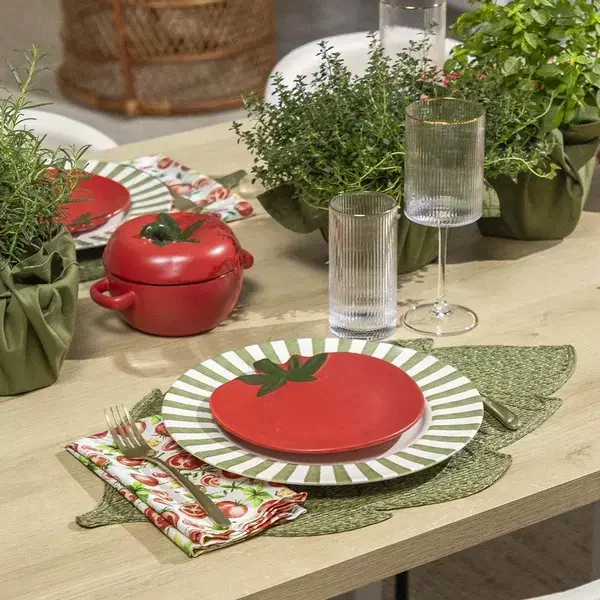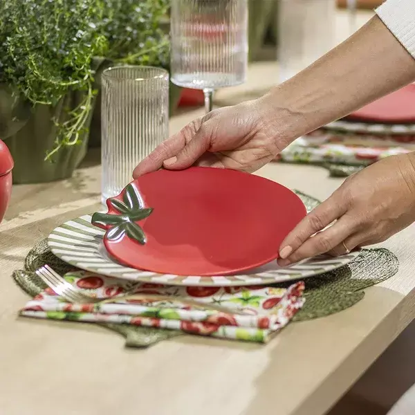 Este prato de sobremesa é uma peça que combina funcionalidade e estética, trazendo um toque divertido e elegante para qualquer refeição. É ideal para quem aprecia louças com personalidade e que complementam temas de culinária natural, italiana ou mediterrânea. Ele pode ser combinado com louças brancas, verdes ou mesmo outras peças da linha de tomate para criar uma mesa posta harmoniosa e convidativa.