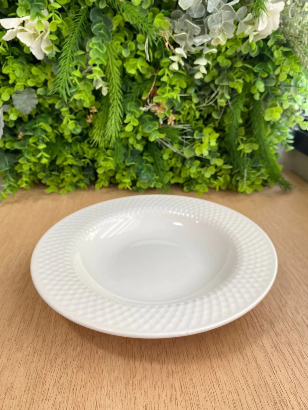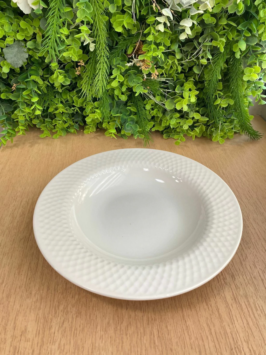 Prato fundo e redondo, na cor branca, com um design elegante e clean. A borda larga do prato possui um padrão em alto-relevo de trama, formando pequenos losangos texturizados. O centro da peça é liso e brilhante, ideal para servir massas, sopas e caldos. A textura da borda adiciona um toque de sofisticação e estilo clássico, tornando o prato uma peça versátil para diversas ocasiões.