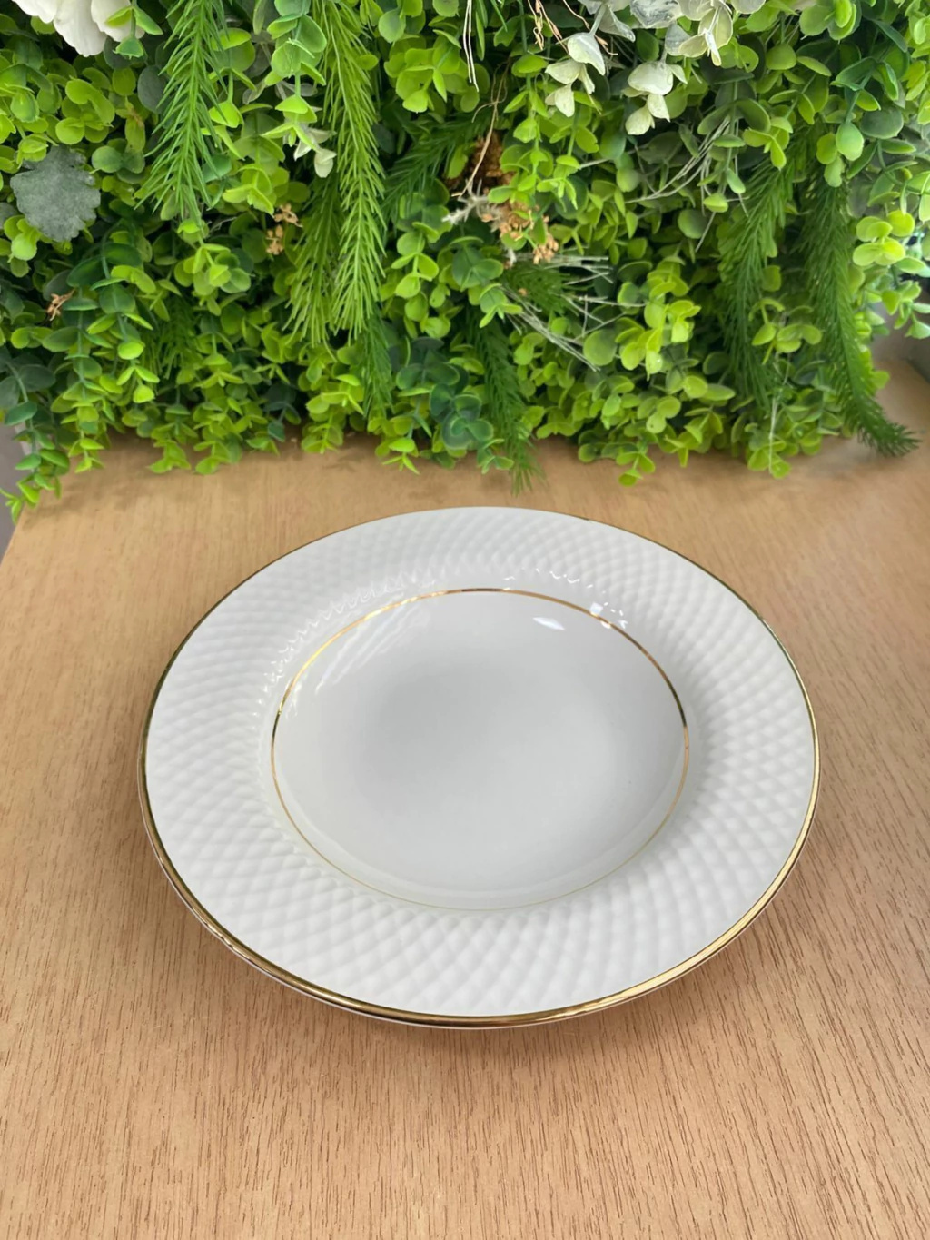 Este é um prato fundo da linha Dubai, ideal para servir sopas, massas ou caldos. Ele apresenta as mesmas características elegantes e sofisticadas da coleção: é feito de porcelana branca de alta qualidade, tem a borda texturizada com um padrão em losangos em relevo e é adornado com um filete dourado que contorna a borda externa e a parte interna.