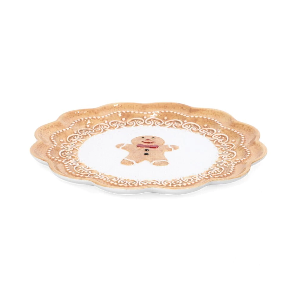 Design Temático Circular: O prato tem um formato redondo clássico com borda ondulada (scalloped) que imita o contorno de um biscoito de gengibre. O design é dividido em um centro branco e uma borda larga em tom de biscoito.