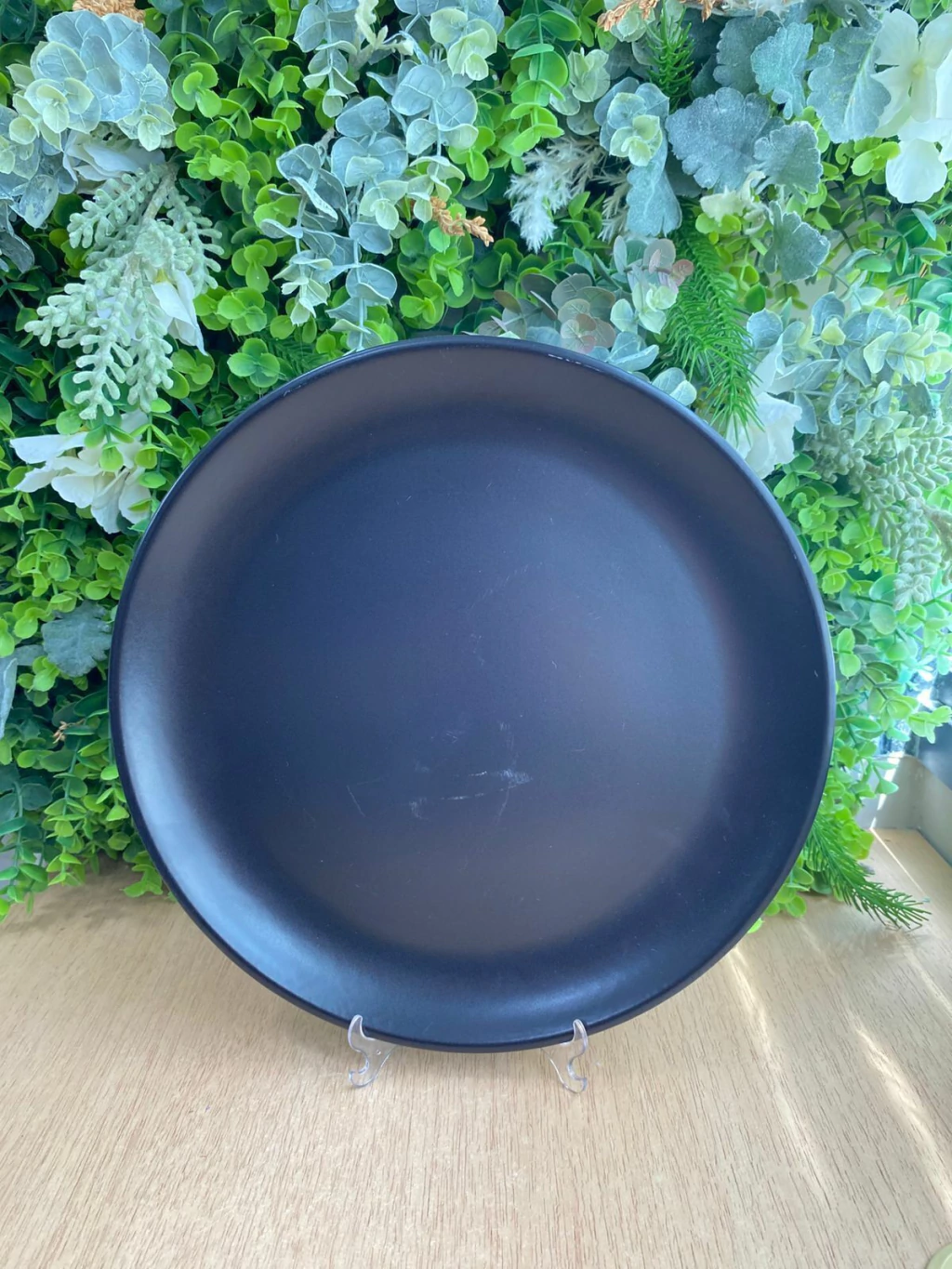 Prato raso e redondo, na cor preta, com um acabamento fosco e elegante. A peça possui um design clean e minimalista, ideal para compor mesas com um toque moderno e sofisticado, É perfeito para servir pratos principais, criando um contraste visual impactante com a comida.