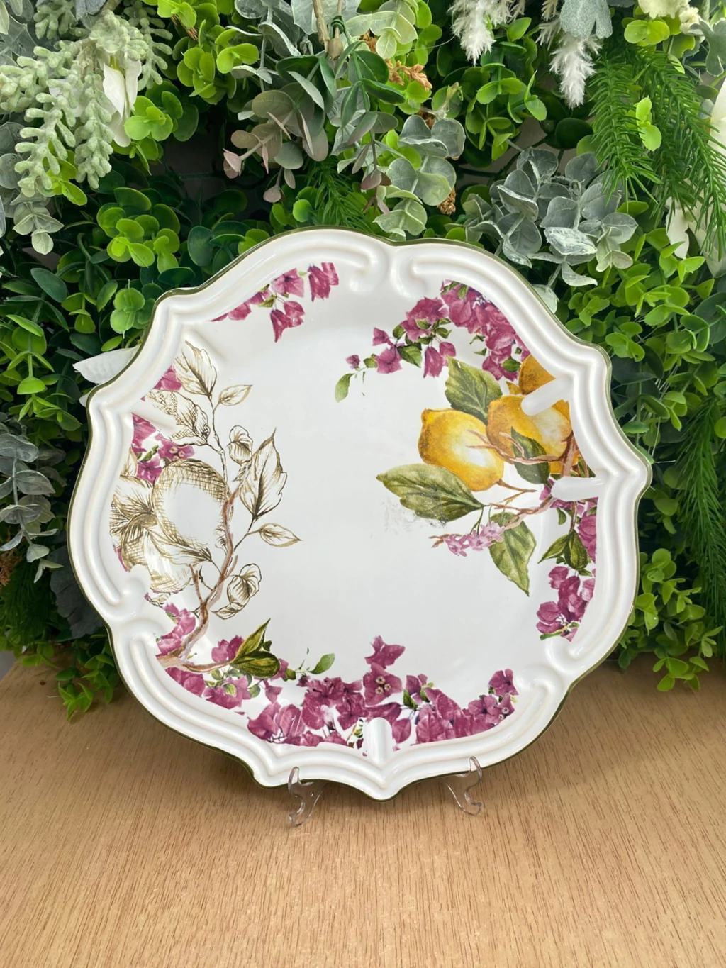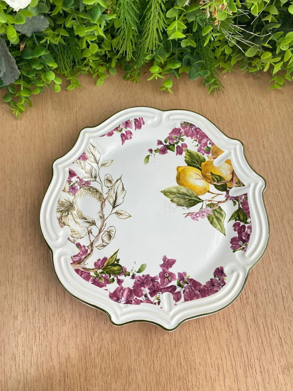 Ideal para ser o protagonista da sua mesa, este prato raso é a tela perfeita para suas criações culinárias, realçando cada receita com um toque de charme e frescor. Seu design vibrante, inspirado nos exuberantes jardins da Riviera, apresenta ilustrações cativantes de limões sicilianos suculentos e flores coloridas que transbordam alegria e elegância.