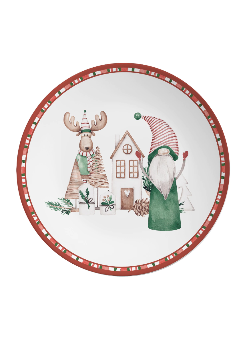 Feito de cerâmica, o prato tem uma estampa lúdica e delicada com um alce de chapéu, um gnomo e uma casa de inverno. A borda da peça é decorada com listras verdes e vermelhas, dando um toque especial de cor e fazendo do prato um item funcional e decorativo.