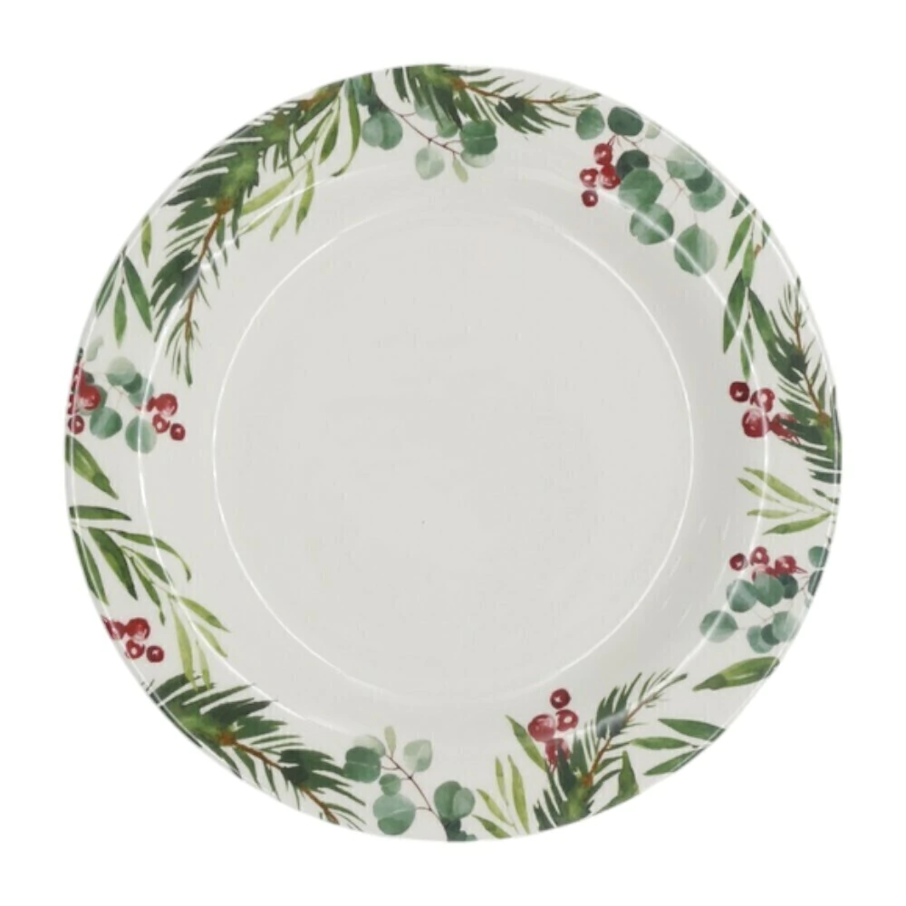 Feito de cerâmica de alta qualidade, ele apresenta uma elegante estampa de folhagens de pinheiro e frutas vermelhas na borda, com um centro branco, criando um visual sofisticado e festivo. É ideal para servir o prato principal da sua ceia ou para compor uma linda decoração.