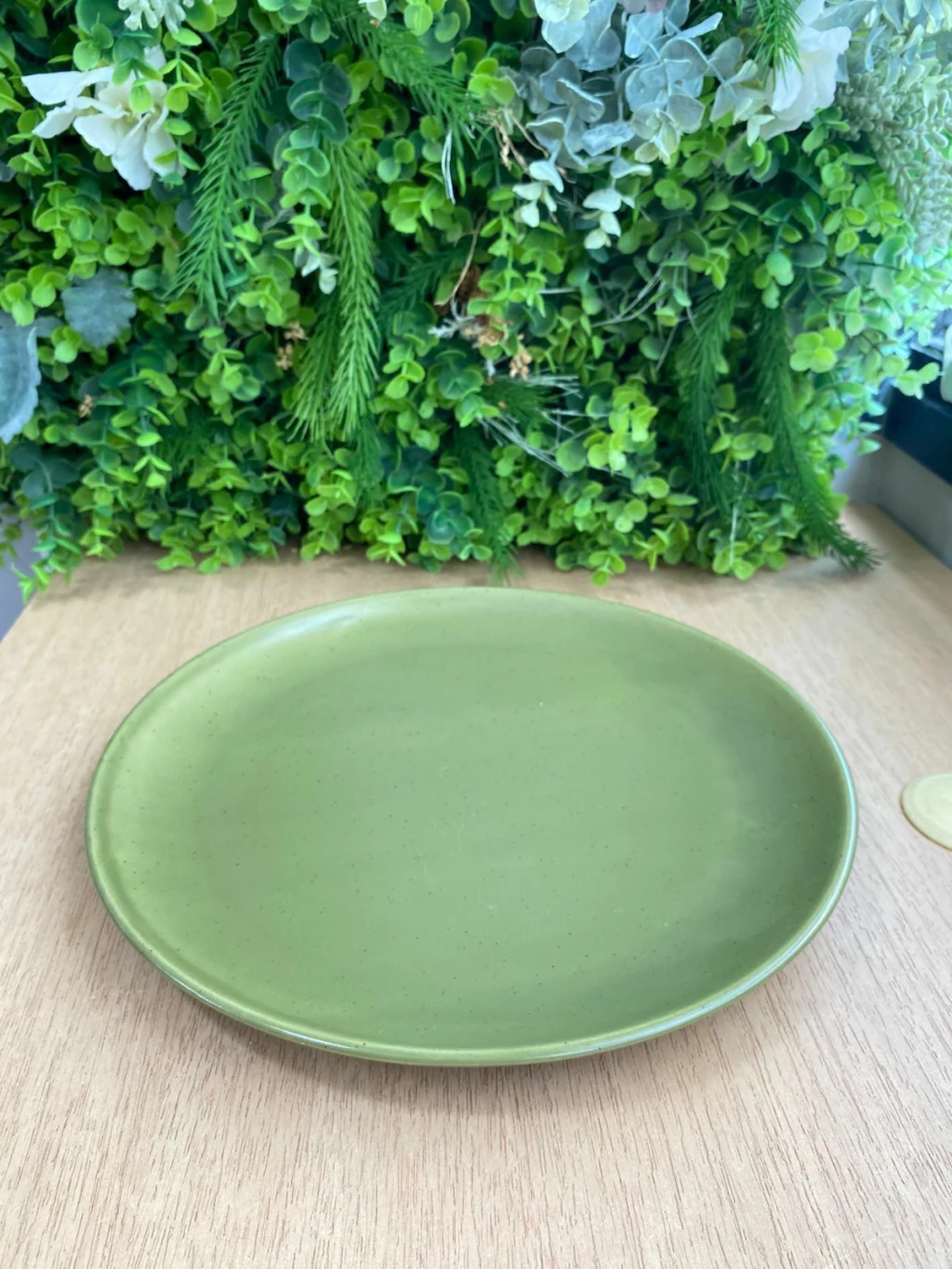 Este é um prato raso da linha Verde Oliva, com um design moderno e minimalista. A peça é feita em cerâmica com um acabamento fosco e uma cor que remete ao verde-oliva, conferindo um visual orgânico e sofisticado.