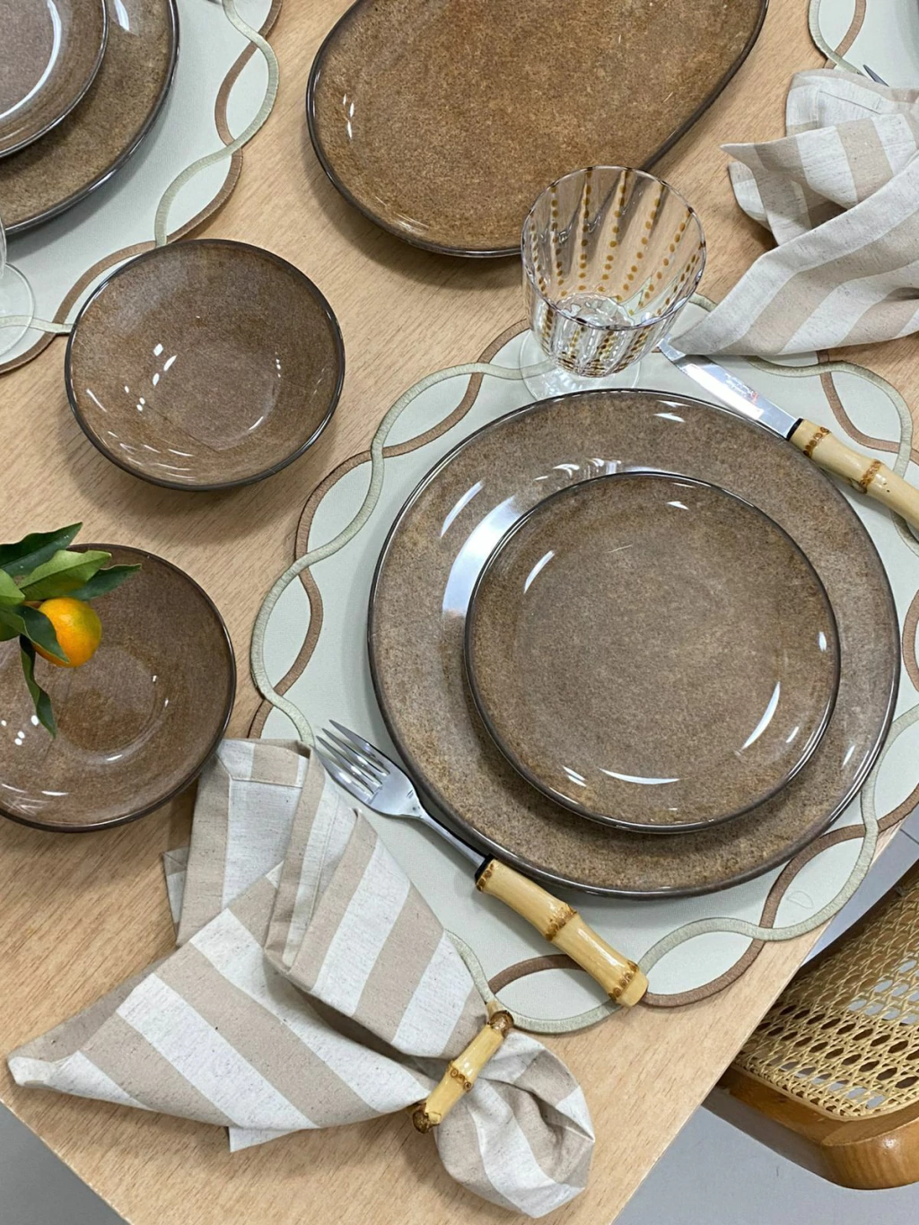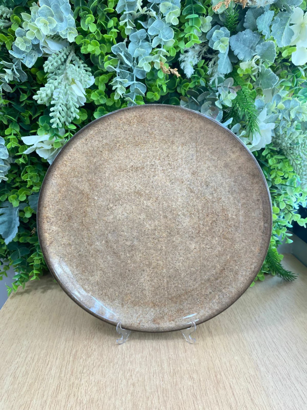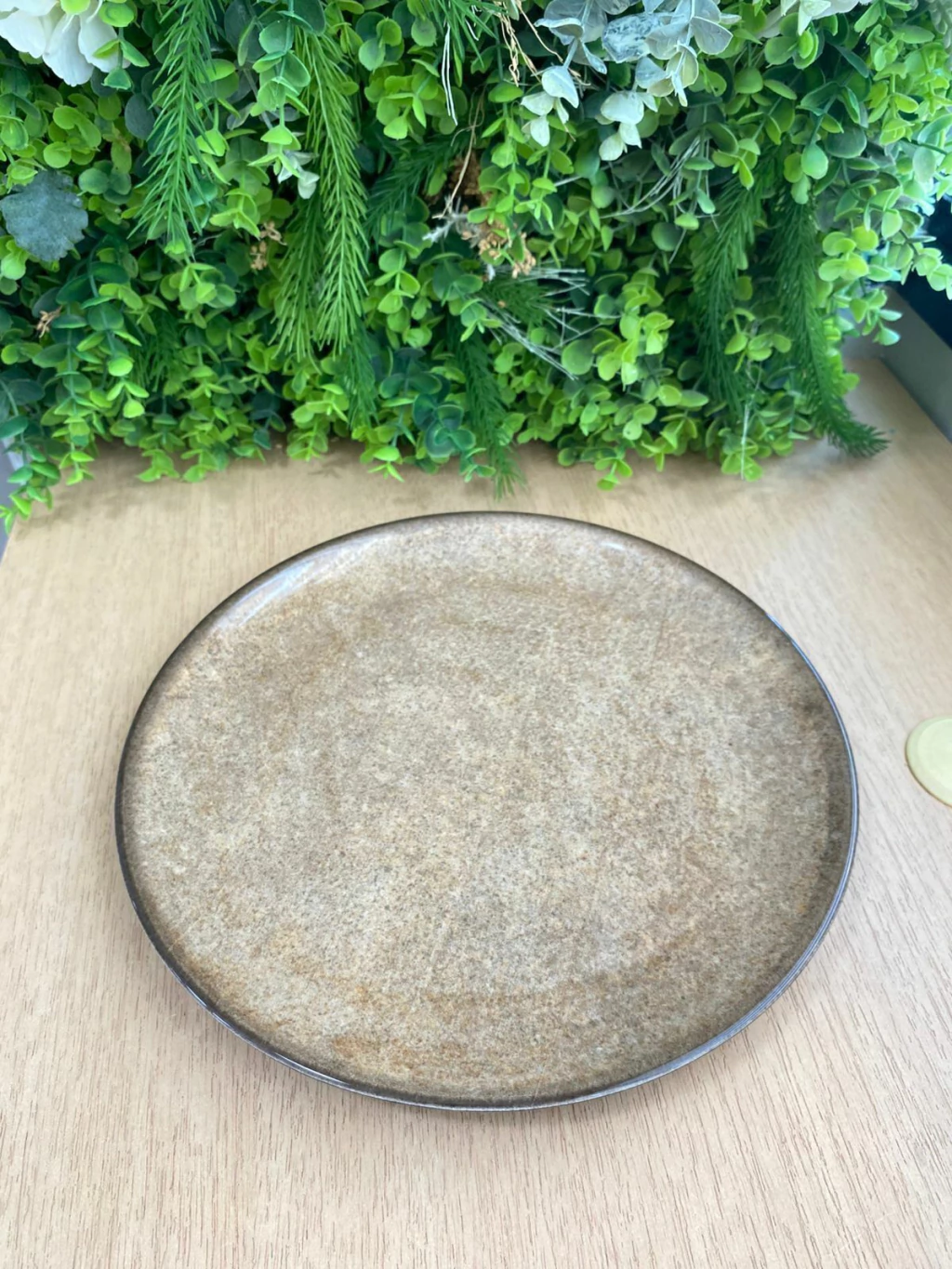 Este é um prato raso da linha Viena, com um design que evoca a beleza natural e a rusticidade elegante. O prato é feito em cerâmica com um acabamento fosco e uma textura que lembra a areia ou a terra, em tons de marrom claro e castanho. A borda é ligeiramente mais escura, criando um contraste sutil que realça o formato do prato. A superfície lisa e a base do prato permitem que seja usado para servir pratos principais ou petiscos.