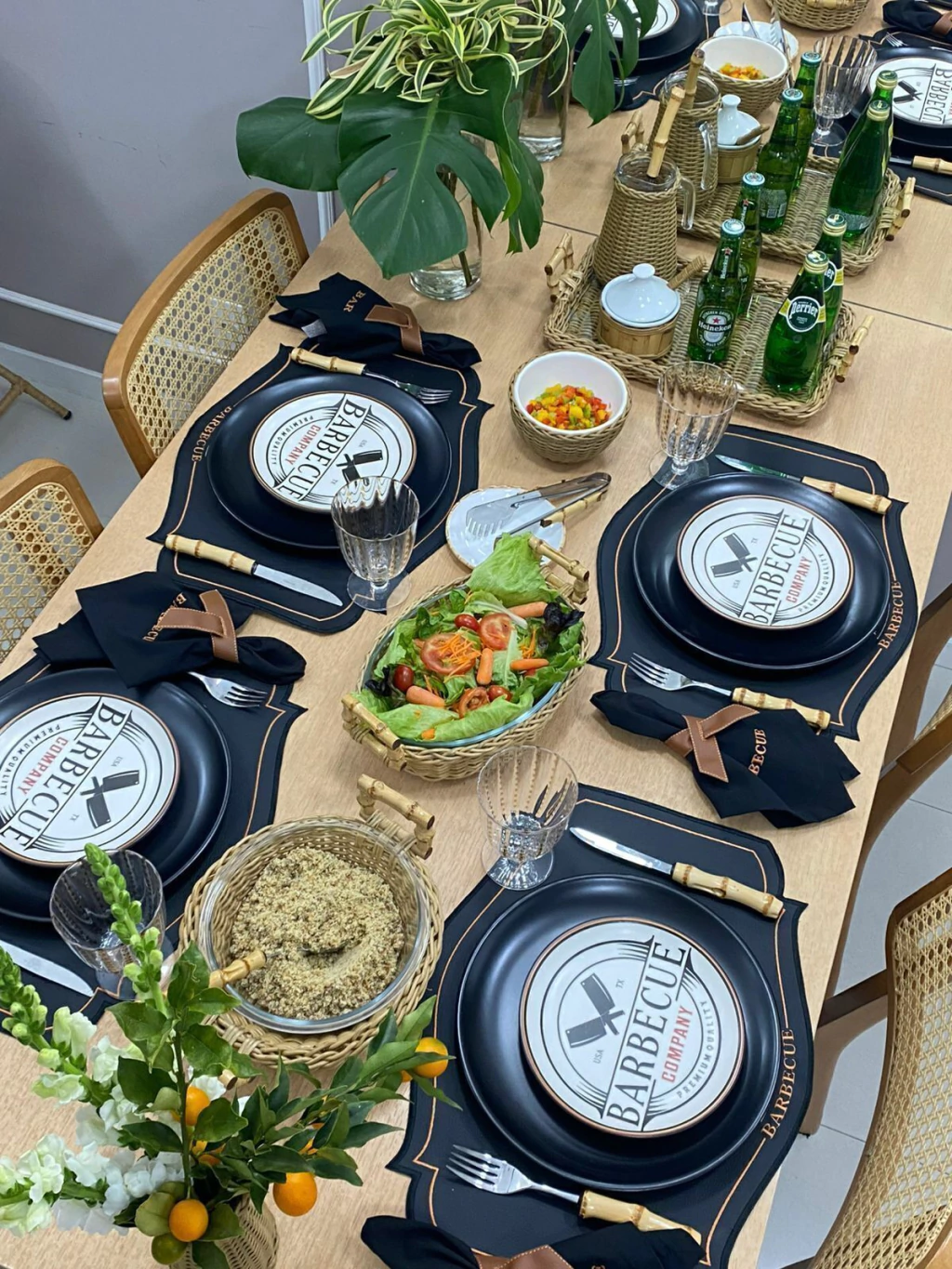Prato de sobremesa redondo, com um design temático de churrasco. A peça é branca e possui uma estampa central em preto e marrom com a frase "BARBECUE COMPANY" e "PREMIUM QUALITY", além de dois cutelos cruzados. A borda do prato é finalizada com um filete na cor marrom, É ideal para servir sobremesas ou petiscos em eventos temáticos de churrasco e encontros casuais.