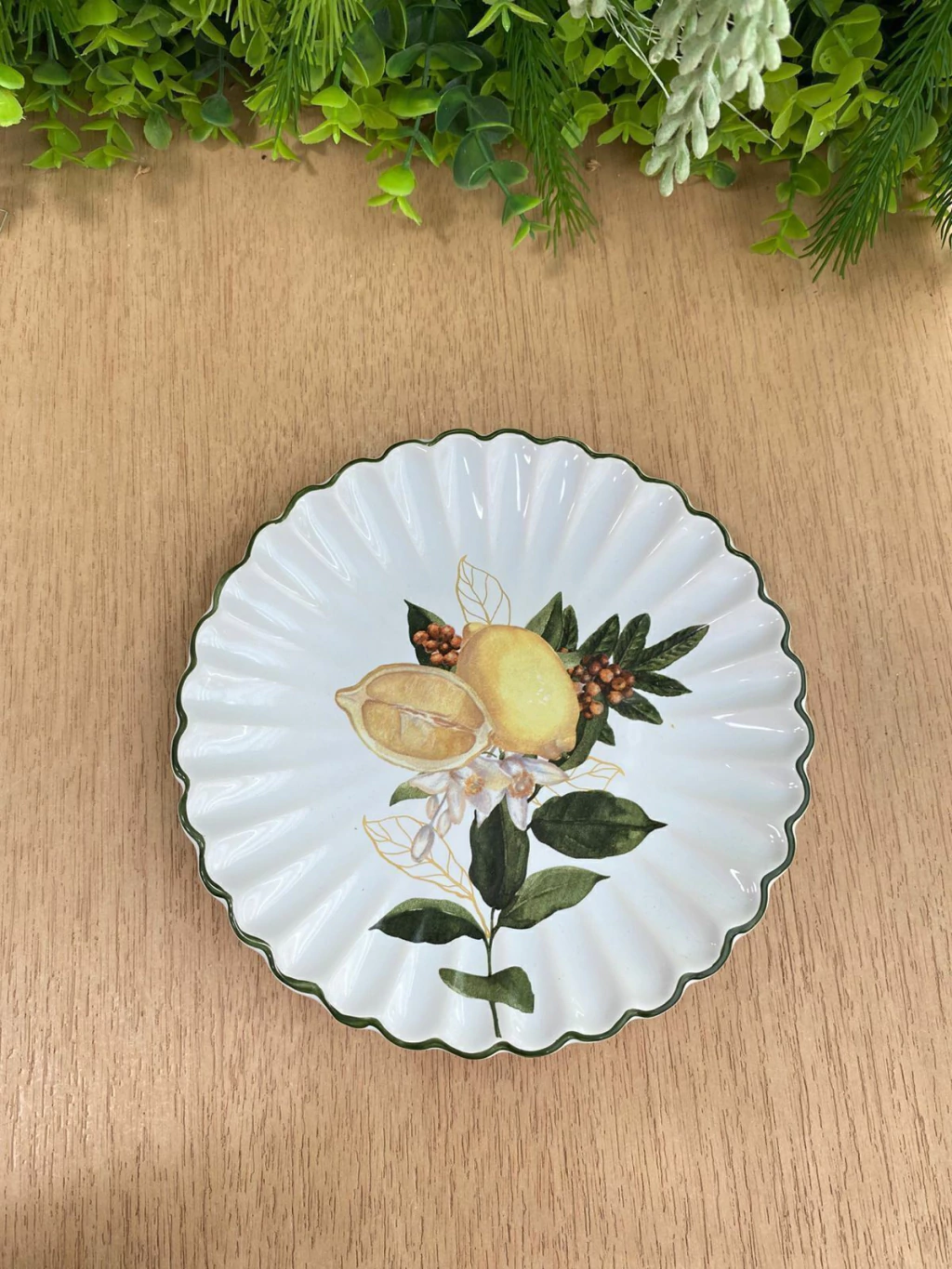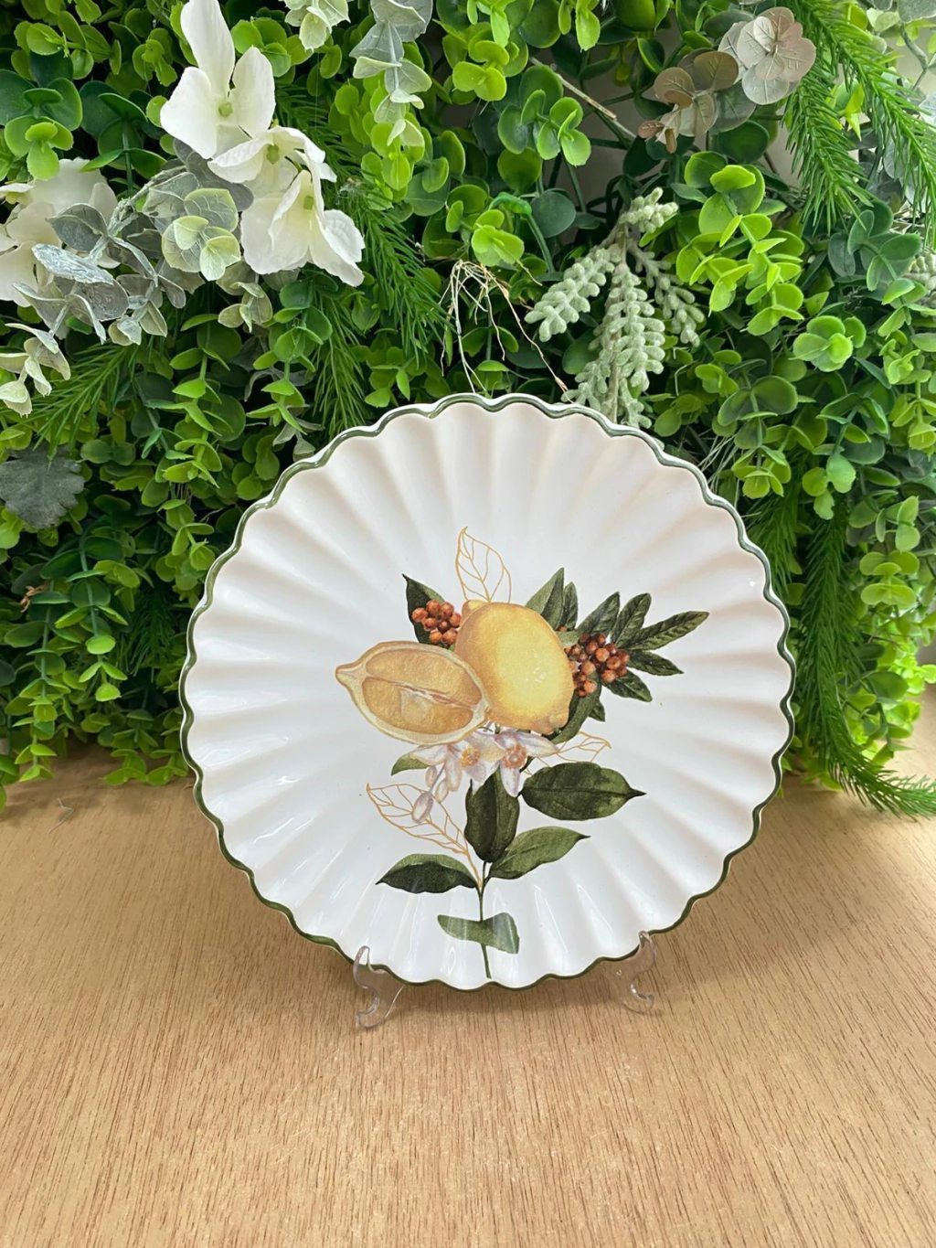 A borda do prato é ondulada com um acabamento sutil em verde musgo, o que complementa a estampa. Ele tem 1,5 cm de altura e 20 cm de diâmetro, sendo ideal para servir sobremesas individuais ou pequenas porções. O design combina o estilo rústico do limão com a sofisticação das bordas onduladas, tornando-o versátil para diversas ocasiões.