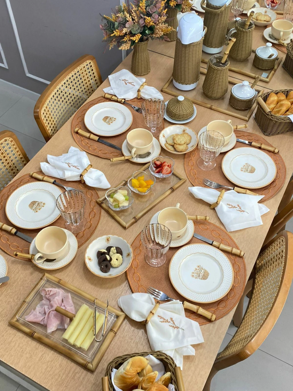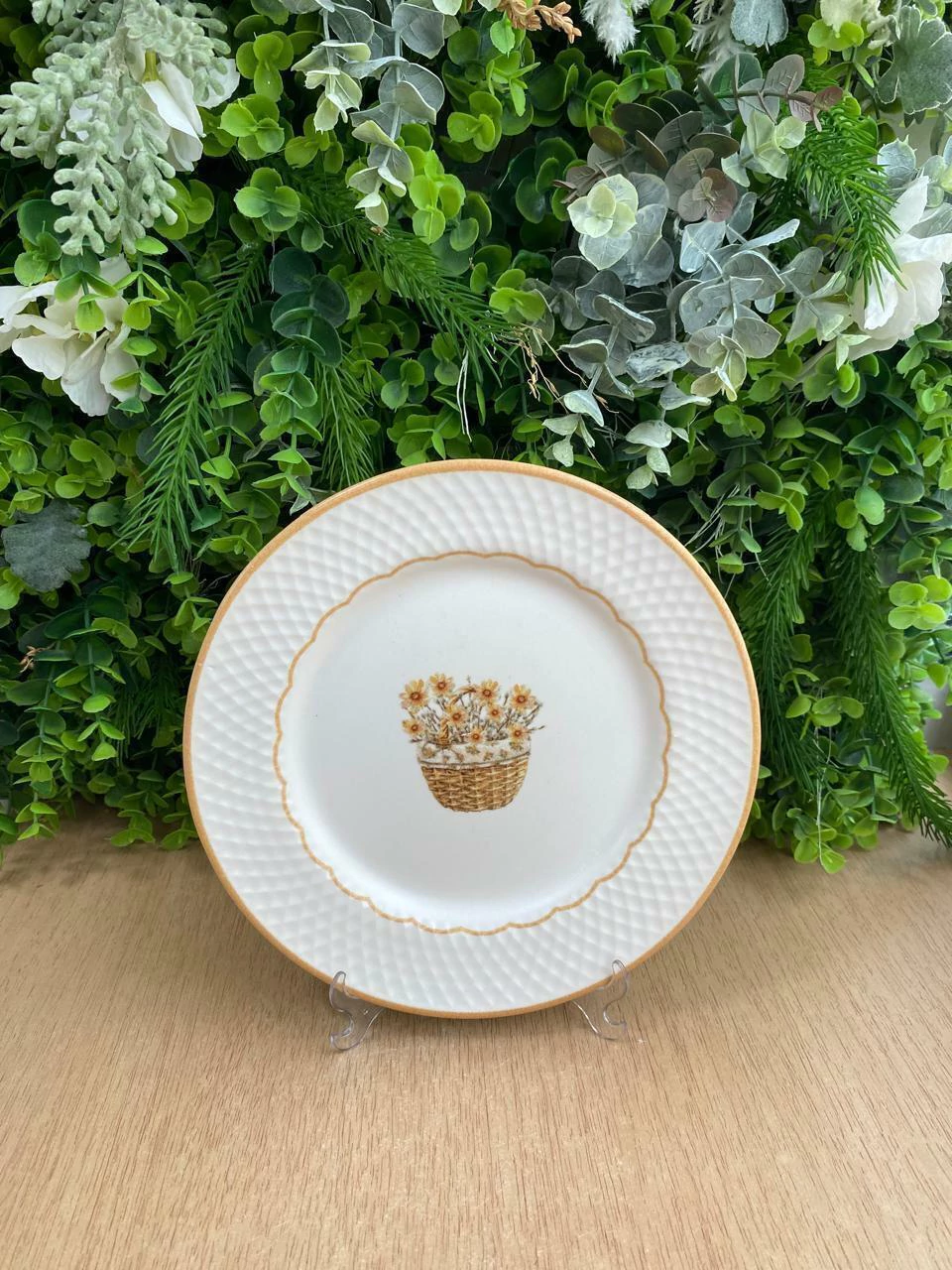 Este é um prato de sobremesa da linha Rústica Campestre, com um design delicado e elegante. O prato é feito de cerâmica branca, com a borda texturizada em um padrão de losangos em relevo e um acabamento em um tom bege ou caramelo. O centro do prato é adornado com uma charmosa estampa de uma cesta de palha cheia de pequenas flores amarelas, conferindo um ar campestre e acolhedor.