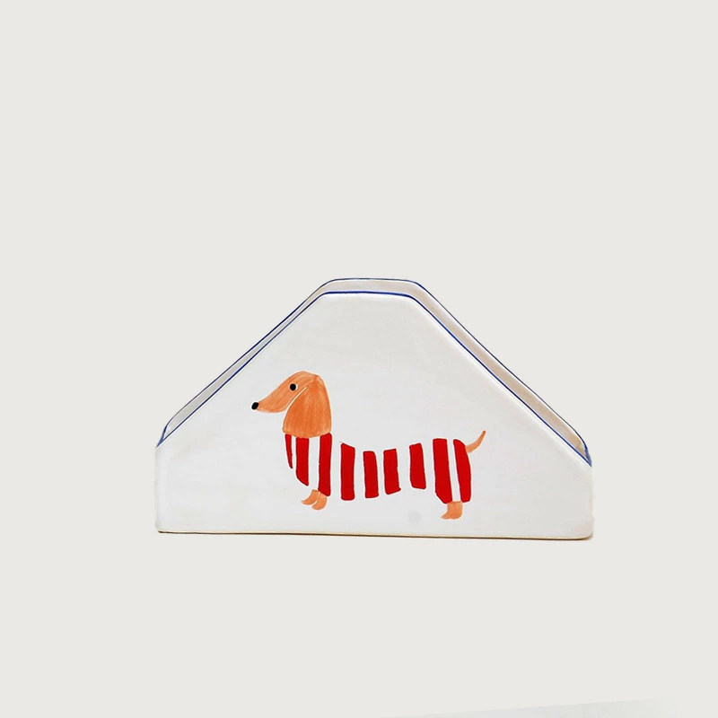 Com um design em cerâmica branca e bordas azuis, ele traz a frase "HOT DOG" e a ilustração de um adorável cachorro da raça dachshund. Além de manter os guardanapos sempre à mão, ele se torna um item decorativo que complementa qualquer refeição