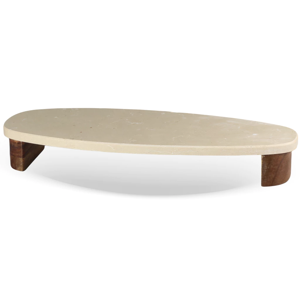 Bases: A tábua é elevada do chão por duas bases robustas e separadas, feitas de madeira maciça em um tom marrom-escuro e quente. As bases são discretas, mas elevam a peça, conferindo-lhe uma aparência de travessa flutuante e protegendo as superfícies de contato. A combinação da pedra fria e clara com a madeira quente e escura cria um contraste visual belíssimo.