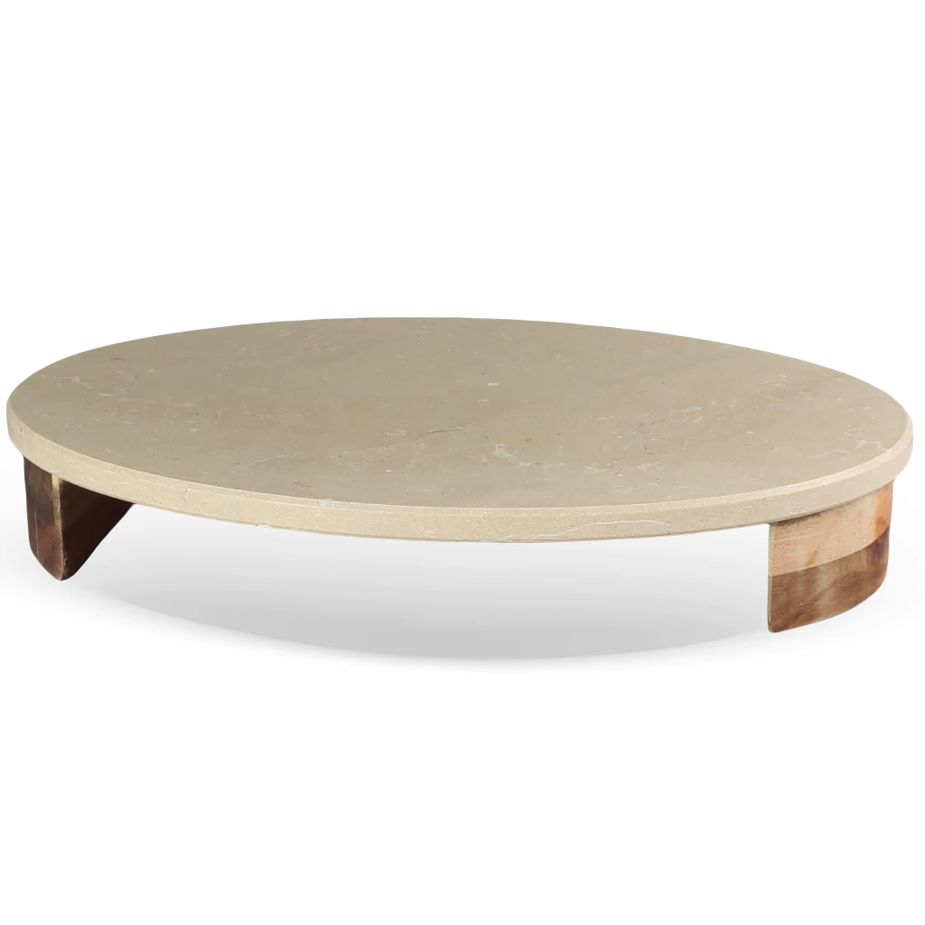 Bases: A tábua é sutilmente elevada por duas bases curtas e sólidas, feitas de madeira maciça em um tom marrom-escuro e quente. As bases são discretas, com formato que lembra um triângulo arredondado ou um pequeno bloco. Elas elevam a peça do plano da mesa, conferindo-lhe um aspecto de bandeja flutuante e protegendo a superfície inferior da pedra.