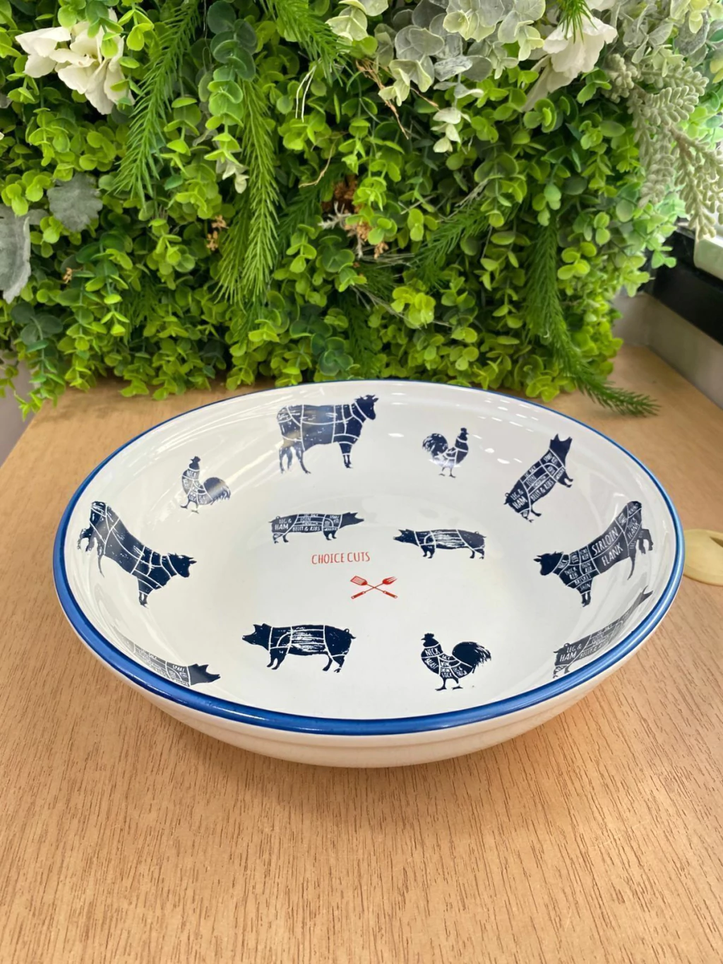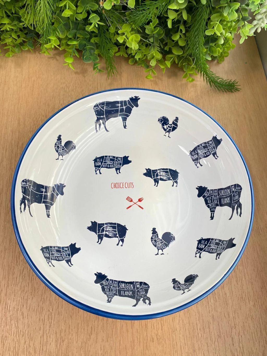 Apresentamos a Tigela "Caminho do Churrasco", uma peça que une funcionalidade e estilo para elevar a experiência do seu churrasco. Com um design único e charmoso, esta tigela redonda de cerâmica traz estampas detalhadas de animais de fazenda e os cortes de carne mais populares, como se fosse um guia para os verdadeiros mestres do churrasco.