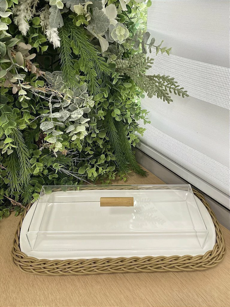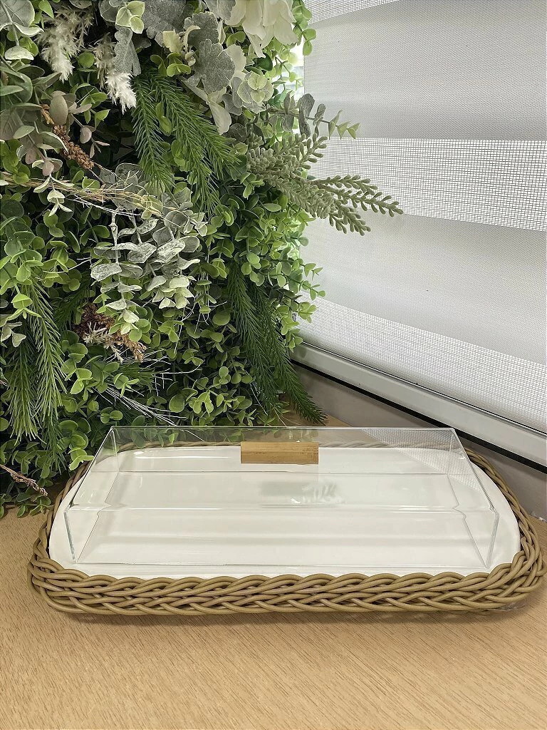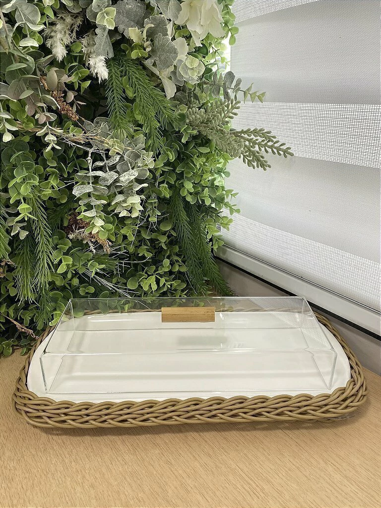 Adicione um toque de requinte natural à sua mesa com esta travessa de cerâmica retangular com detalhes em vime, tampa de acrílico e puxador de bambu. Uma peça que une funcionalidade, beleza e um toque artesanal encantador.