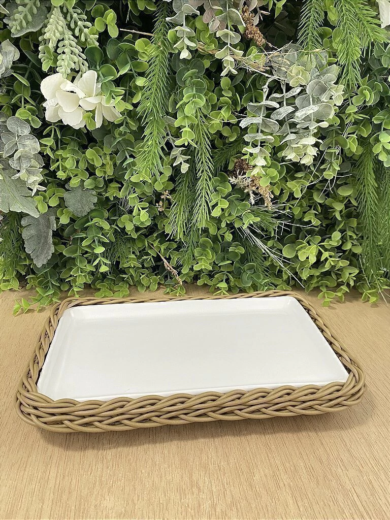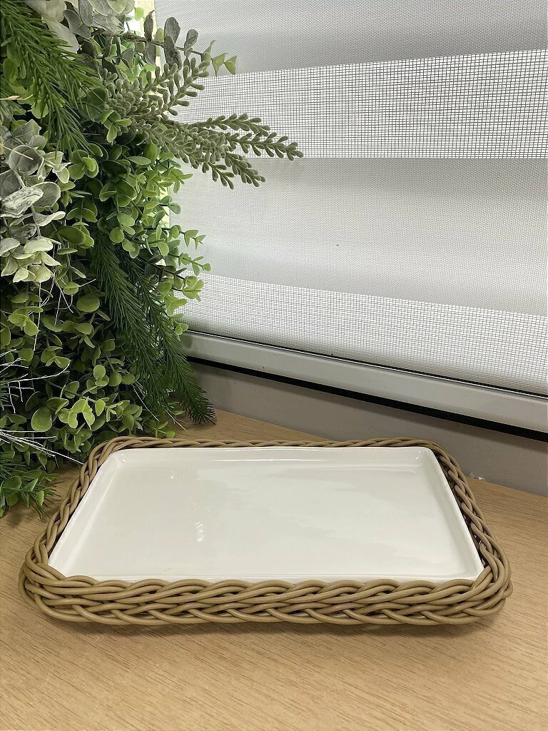 Esta charmosa travessa retangular pequena combina a beleza rústica do vime com a elegância atemporal da cerâmica. Com um acabamento em tom caramelo quente e convidativo, a peça irradia um toque artesanal que eleva qualquer apresentação.