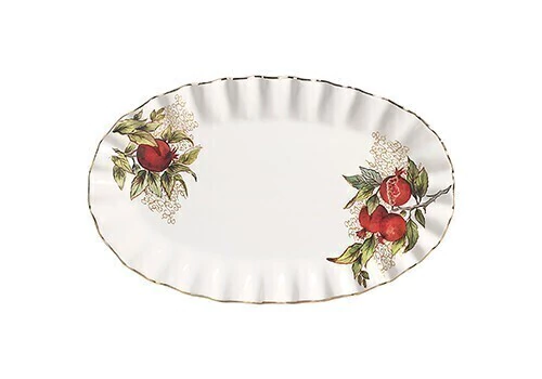 Tema Principal (Romã): A travessa é adornada com duas grandes ilustrações de frutas de romã maduras em tons de vermelho e vinho, com folhas verdes e galhos. A romã é um símbolo tradicional de prosperidade, fartura e boa sorte.