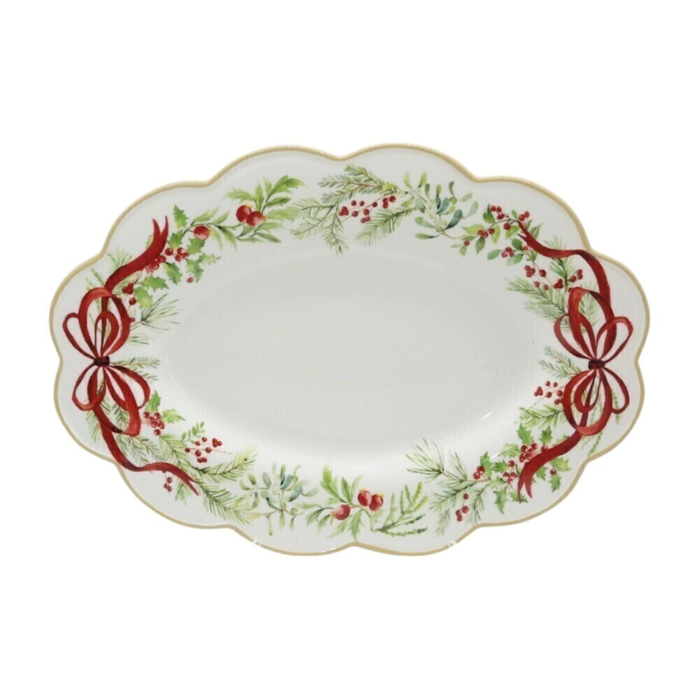 Com uma borda emoldurada por uma estampa delicada de guirlanda, com folhas de azevinho, bagas vermelhas e laços de fita, ela traz o espírito da celebração para a sua casa. O formato oval e o tamanho generoso são ideais para servir o prato principal da ceia, assados e acompanhamentos, unindo funcionalidade e um design clássico e festivo.