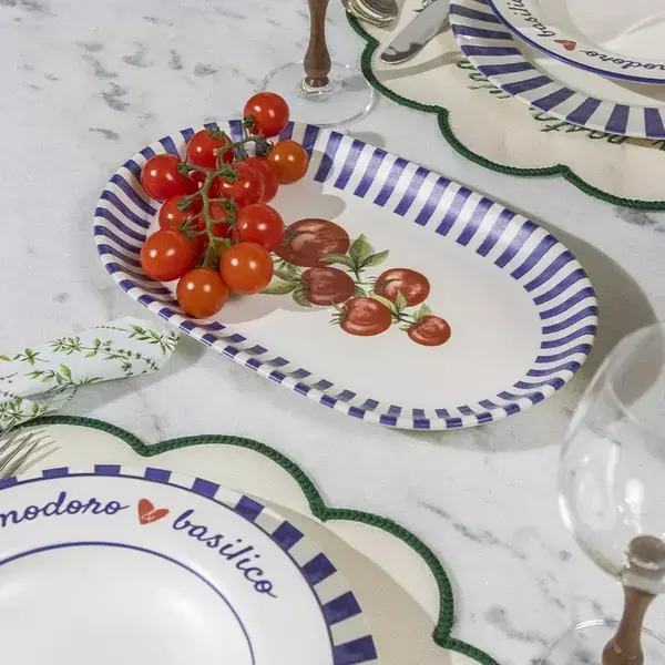 Decoração Central: O centro da travessa é decorado com uma delicada ilustração em estilo aquarela de um ramo de tomates (Pomodoro) e folhagens verdes (Basilico), remetendo ao frescor e aos sabores autênticos da Itália.